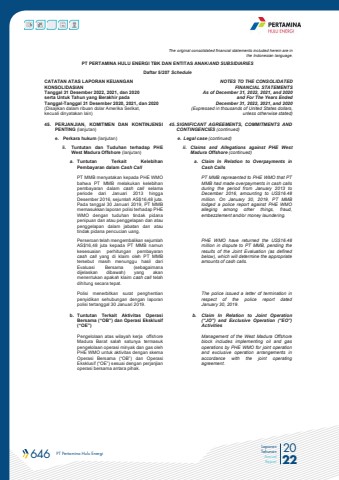 646 PT Pertamina Hulu Energi 2022Laporan TahunanAnnual ReportThe original consolidated financial statements included herein are in the Indonesian language.PT PERTAMINA HULU ENERGI TBK DAN ENTITAS ANAK/AND SUBSIDIARIES Daftar 5/207 ScheduleCATATAN ATAS LAPORAN KEUANGANKONSOLIDASIANTanggal 31 Desember 2022, 2021, dan 2020serta Untuk Tahun yang Berakhir padaTanggal-Tanggal 31 Desember 2020, 2021, dan 2020(Disajikan dalam ribuan dolar Amerika Serikat, kecuali dinyatakan lain)NOTES TO THE CONSOLIDATEDFINANCIAL STATEMENTSAs of December 31, 2022, 2021, and 2020and For The Years Ended December 31, 2022, 2021, and 2020 (Expressed in thousands of United States dollars,unless otherwise stated)45. PERJANJIAN, KOMITMEN DAN KONTINJENSI PENTING (lanjutan)45. SIGNIFICANT AGREEMENTS, COMMITMENTS AND CONTINGENCIES (continued)e. Perkara hukum (lanjutan) e. Legal case (continued)ii. Tuntutan dan Tuduhan terhadap PHE West Madura Offshore (lanjutan)ii. Claims and Allegations against PHE West Madura Offshore (continued)a. Tuntutan Terkait Kelebihan Pembayaran dalam Cash Calla. Claim In Relation to Overpayments in Cash CallsPT MMB menyatakan kepada PHE WMO bahwa PT MMB melakukan kelebihan pembayaran dalam cash call selama periode dari Januari 2013 hingga Desember 2016, sejumlah AS$16,48 juta. Pada tanggal 30 Januari 2019, PT MMB memasukkan laporan polisi terhadap PHE WMO dengan tuduhan tindak pidana penipuan dan atau penggelapan dan ataupenggelapan dalam jabatan dan atau tindak pidana pencucian uang.PT MMB represented to PHE WMO that PT MMB had made overpayments in cash calls during the period from January 2013 to December 2016, amounting to US$16.48 million. On January 30, 2019, PT MMB lodged a police report against PHE WMO alleging among other things, fraud, embezzlement and/or money laundering.Perseroan telah mengembalikan sejumlah AS$16,48 juta kepada PT MMB namun kesesuaian perhitungan pembayaran cash call yang di klaim oleh PT MMB tersebut masih menunggu hasil dari Evaluasi Bersama (sebagaimana dijelaskan dibawah) yang akan menentukan apakah klaim cash call telah dihitung secara tepat. Polisi menerbitkan surat penghentian penyidikan sehubungan dengan laporan polisi tertanggal 30 Januari 2019.b. Tuntutan Terkait Aktivitas Operasi Bersama (%u201cOB%u201d) dan Operasi Eksklusif (%u201cOE%u201d) Pengelolaan atas wilayah kerja offshore Madura Barat salah satunya termasuk pengelolaan operasi minyak dan gas oleh PHE WMO untuk aktivitas dengan skema Operasi Bersama (%u201cOB%u201d) dan Operasi Eksklusif (%u201cOE%u201d) sesuai dengan perjanjian operasi bersama antara pihak.PHE WMO have returned the US$16.48 million in dispute to PT MMB, pending the results of the Joint Evaluation (as defined below), which will determine the appropriate amounts of cash calls. The police issued a letter of termination in respect of the police report dated January 30, 2019.b. Claim In Relation to Joint Operation (%u201cJO%u201d) and Exclusive Operation (%u201cEO%u201d) Activities Management of the West Madura Offshore block includes implementing oil and gas operations by PHE WMO for joint operation and exclusive operation arrangements in accordance with the joint operating agreement.