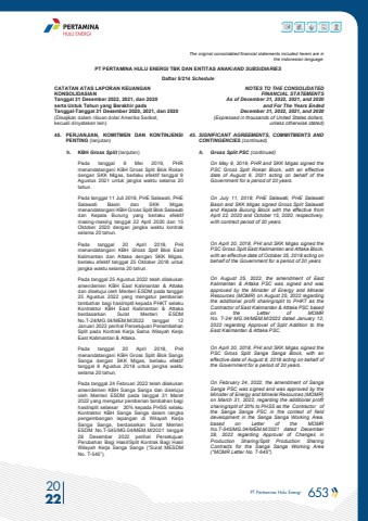 PT Pertamina Hulu Energi 653 2022The original consolidated financial statements included herein are in the Indonesian language.PT PERTAMINA HULU ENERGI TBK DAN ENTITAS ANAK/AND SUBSIDIARIES Daftar 5/214 ScheduleCATATAN ATAS LAPORAN KEUANGANKONSOLIDASIANTanggal 31 Desember 2022, 2021, dan 2020serta Untuk Tahun yang Berakhir padaTanggal-Tanggal 31 Desember 2020, 2021, dan 2020(Disajikan dalam ribuan dolar Amerika Serikat, kecuali dinyatakan lain)NOTES TO THE CONSOLIDATEDFINANCIAL STATEMENTSAs of December 31, 2022, 2021, and 2020and For The Years Ended December 31, 2022, 2021, and 2020 (Expressed in thousands of United States dollars,unless otherwise stated)45. PERJANJIAN, KOMITMEN DAN KONTINJENSI PENTING (lanjutan)45. SIGNIFICANT AGREEMENTS, COMMITMENTS AND CONTINGENCIES (continued)h. KBH Gross Split (lanjutan) h. Gross Split PSC (continued)Pada tanggal 9 Mei 2019, PHR menandatangani KBH Gross Split Blok Rokan dengan SKK Migas, berlaku efektif tanggal 9 Agustus 2021 untuk jangka waktu selama 20 tahun.Pada tanggal 11 Juli 2018, PHE Salawati, PHE Salawati Basin dan SKK Migas menandatangani KBH Gross Split Blok Salawati dan Kepala Burung yang berlaku efektif masing-masing tanggal 22 April 2020 dan 15 Oktober 2020 dengan jangka waktu kontrak selama 20 tahun.Pada tanggal 20 April 2018, PHImenandatangani KBH Gross Split Blok East Kalimantan dan Attaka dengan SKK Migas, berlaku efektif tanggal 25 Oktober 2018 untuk jangka waktu selama 20 tahun.Pada tanggal 25 Agustus 2022 telah dilakukan amendemen KBH East Kalimantan & Attaka dan disetujui oleh Menteri ESDM pada tanggal 25 Agustus 2022 yang mengatur pemberian tambahan bagi hasil/split kepada PHKT selaku Kontraktor KBH East Kalimantan & Attaka berdasarkan Surat Menteri ESDM No.T-24/MG.04/MEM.M/2022 tanggal 12 Januari 2022 perihal Persetujuan Penambahan Split pada Kontrak Kerja Sama Wilayah Kerja East Kalimantan & Attaka.Pada tanggal 20 April 2018, PHImenandatangani KBH Gross Split Blok Sanga Sanga dengan SKK Migas, berlaku efektif tanggal 8 Agustus 2018 untuk jangka waktu selama 20 tahun.Pada tanggal 24 Februari 2022 telah dilakukan amendemen KBH Sanga Sanga dan disetujui oleh Menteri ESDM pada tanggal 31 Maret 2022 yang mengatur pemberian tambahan bagi hasil/split sebesar 20% kepada PHSS selaku Kontraktor KBH Sanga Sanga dalam rangka pengembangan lapangan di Wilayah Kerja Sanga Sanga, berdasarkan Surat Menteri ESDM No.T-545/MG.04/MEM.M/2021 tanggal 28 Desember 2022 perihal Persetujuan Perubahan Bagi Hasil/Split Kontrak Bagi Hasil Wilayah Kerja Sanga Sanga (%u201cSurat MESDM No. T-545%u201d).On May 9, 2019, PHR and SKK Migas signed the PSC Gross Split Rokan Block, with an effective date of August 9, 2021 acting on behalf of the Government for a period of 20 years.On July 11, 2018, PHE Salawati, PHE Salawati Basin and SKK Migas signed Gross Split Salawati and Kepala Burung Block with the effective from April 22, 2020 and October 15, 2020, respectively, with contract period of 20 years.On April 20, 2018, PHI and SKK Migas signed the PSC Gross Split East Kalimantan and Attaka Block, with an effective date of October 25, 2018 acting on behalf of the Government for a period of 20 years.On August 25, 2022, the amendment of East Kalimantan & Attaka PSC was signed and was approved by the Minister of Energy and Mineral Resources (MOMR) on August 25, 2022 regarding the additional profit sharing/split to PHKT as the Contractor of East Kalimantan & Attaka PSC based on the Letter of MOMR No. T-24/ MG.04/MEM.M/2022 dated January 12, 2022 regarding Approval of Split Addition to the East Kalimantan & Attaka PSC. On April 20, 2018, PHI and SKK Migas signed the PSC Gross Split Sanga Sanga Block, with an effective date of August 8, 2018 acting on behalf of the Government for a period of 20 years.On February 24, 2022, the amendment of Sanga Sanga PSC was signed and was approved by the Minister of Energy and Mineral Resources (MOMR) on March 31, 2022, regarding the additional profit sharing/split of 20% to PHSS as the Contractor of the Sanga Sanga PSC in the context of field development in the Sanga Sanga Working Area, based on Letter of the MOMR No.T-545/MG.04/MEM.M/2021 dated December 28, 2022 regarding Approval of Changes in Production Sharing/Split Production Sharing Contracts for the Sanga Sanga Working Area (\