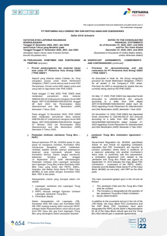 654 PT Pertamina Hulu Energi 2022Laporan TahunanAnnual ReportThe original consolidated financial statements included herein are in the Indonesian language.PT PERTAMINA HULU ENERGI TBK DAN ENTITAS ANAK/AND SUBSIDIARIES Daftar 5/215 ScheduleCATATAN ATAS LAPORAN KEUANGANKONSOLIDASIANTanggal 31 Desember 2022, 2021, dan 2020serta Untuk Tahun yang Berakhir padaTanggal-Tanggal 31 Desember 2020, 2021, dan 2020(Disajikan dalam ribuan dolar Amerika Serikat, kecuali dinyatakan lain)NOTES TO THE CONSOLIDATEDFINANCIAL STATEMENTSAs of December 31, 2022, 2021, and 2020and For The Years Ended December 31, 2022, 2021, and 2020 (Expressed in thousands of United States dollars,unless otherwise stated)45. PERJANJIAN, KOMITMEN DAN KONTINJENSI PENTING (lanjutan)45. SIGNIFICANT AGREEMENTS, COMMITMENTS AND CONTINGENCIES (continued)i. Provisi pembongkaran dan restorasi lokasi aset untuk PT Pertamina Hulu Energi OSES (%u201cPHE OSES%u201d)i. Provision for decommisioning and site restoration for PT Pertamina Hulu Energi OSES (%u201cPHE OSES%u201d)Seperti yang dibahas dalam Catatan 3o, Grup mengakui provisi untuk Asset Retirement Obligation (%u201cARO%u201d) untuk semua aset di area PSC Perusahaan. Provisi untuk ARO diakui untuk aset yang saat ini digunakan oleh PHE OSES. Pada tanggal 17 Mei 2022, PHE OSES telah melakukan penyetoran dana sebesar AS$226.045,35 (nilai penuh) mengacu Surat SKK Migas SRT-0143/SKKMG1000/2022/S4 tanggal 28 April 2022 hal Penempatan Dana Abandonment and Site Restoration (ASR) Semester I Tahun 2022. Pada tanggal 14 November 2022, PHE OSES telah melakukan penyetoran dana sebesar AS$195.055,37 (nilai penuh) mengacu Surat SKK Migas SRT-0403/SKKMG1000/2022/S4 tanggal 27 Oktober 2022 hal Penempatan Dana Abandonment and Site Restoration (ASR) Semester II Tahun 2022. As discussed in Note 3o, the Group recognizes provision for Asset Retirement Obligation (%u201cARO%u201d) for all assets in the Company%u2019s PSC areas. Provision for ARO is recognized for assets that are currently being used by the PHE OSES. On May 17, 2022, PHE OSES has deposited funds amounted to US$226,045.35 (full amount) according to a letter from SKK Migas SRT-0143/SKKMG1000/2022/S4 dated April 28, 2022 regarding Funds Placement for Abandonment and Site Restoration (ASR) Semester I Year 2022.On November 14, 2022, PHE OSES has deposited funds amounted to US$195,055.37 (full amount) according to a letter from SKK Migas SRT0403/SKKMG1000/2022/S4 dated October 27, 2022 regarding Funds Placement for Abandonment and Site Restoration (ASR) Semester II Year 2022.j. Perjanjian Unitisasi Jambaran Tiung Biru -PEPCj. Jambaran Tiung Biru Unitization Agreement -PEPCSesuai ketentuan PP No. 35/2004 pasal 41 dan pasal 42 mengenai Unitisasi, Kontraktor KKS mempunyai kewajiban untuk melakukan Unitisasi apabila terbukti adanya pelamparan reservoir yang memasuki wilayah kerja Kontraktor lainnya. Dalam rangka memenuhi ketentuan tersebut, pada tanggal 14 September 2012, telah ditandatangani Perjanjian Unitisasi (UA) Lapangan Jambaran dan Lapangan Tiung Biru antara Kontraktor KKS Blok Cepu yang terdiri dari PEPC, EMCL, Ampolex, dan Badan Kerja Sama PI Blok Cepu (BUMD) di satu pihak dengan Kontraktor KKS Blok PEP di lain pihak.Government Regulation No. 35/2004, specifically Article 41 and Article 42 regarding Unitisation stipulates that PSC Contractors are required to conduct unitisation where there is evidence of a reservoir extending into another Contractor%u2019s Work Area. In conformity with this requirement, a Unitisation Agreement (UA) related to the Jambaran and Tiung Biru Fields was signed on September 14, 2012 between the Cepu Block PSC Contractors - composed of the PEPC, EMCL, Ampolex and the Badan Kerja Sama PI of the Cepu Block (BUMD) as one party, with PEP as the other party. Kesepakatan utama yang tercapai dalam UA adalah:The main covenants agreed upon in the UA are as follows:1. Lapangan Jambaran dan Lapangan Tiung Biru diunitisasi.2. PEPC ditunjuk sebagai Operator Unitisasi Lapangan Jambaran-Tiung Biru.3. Penetapan Equity.1. The Jambaran Field and the Tiung Biru Field shall be unitised.2. The Company is designated as the operator of the Jambaran-Tiung Biru Fields Unitisation.3. Equity Determination.Selain kesepakatan UA Lapangan JTB, Kontraktor KKS WK Cepu dan Kontraktor KKS WK PEP masing-masing telah menunjuk PEPC sebagai Seller Representative untuk seluruh gas bumi WK Cepu dan gas bumi lapangan Tiung Biru yang dituangkan dalam perjanjian terpisah.In addition to the covenants set out in the UA of the JTB Fields, the Cepu Block PSC Contractors and the PEP Block PSC Contractor have each designated the PEPC as the Seller%u2019s Representative for all of the Cepu Block natural gas and the Tiung Biru field natural gas in separate agreements.