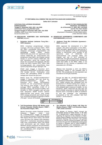 656 PT Pertamina Hulu Energi 2022Laporan TahunanAnnual ReportThe original consolidated financial statements included herein are in the Indonesian language.PT PERTAMINA HULU ENERGI TBK DAN ENTITAS ANAK/AND SUBSIDIARIES Daftar 5/217 ScheduleCATATAN ATAS LAPORAN KEUANGANKONSOLIDASIANTanggal 31 Desember 2022, 2021, dan 2020serta Untuk Tahun yang Berakhir padaTanggal-Tanggal 31 Desember 2020, 2021, dan 2020(Disajikan dalam ribuan dolar Amerika Serikat, kecuali dinyatakan lain)NOTES TO THE CONSOLIDATEDFINANCIAL STATEMENTSAs of December 31, 2022, 2021, and 2020and For The Years Ended December 31, 2022, 2021, and 2020 (Expressed in thousands of United States dollars,unless otherwise stated)45. PERJANJIAN, KOMITMEN DAN KONTINJENSI PENTING (lanjutan)45. SIGNIFICANT AGREEMENTS, COMMITMENTS AND CONTINGENCIES (continued)j. Perjanjian Unitisasi Jambaran Tiung Biru -PEPC (lanjutan) j. Jambaran Tiung Biru Unitization Agreement -PEPC (continued)EMCL menyetujui pengembangan Unitisasi Lapangan JTB tanpa partisipasi EMCL. PEPC dan EMCL menyepakati bahwa biaya yang ditetapkan sehubungan pengambilalihan unit participating interest adalah sebesar AS$103.000 yang terdiri dari opportunity valuesebesar AS$32.600 dan reimbursement atas pengeluaran biaya EMCL dan Ampolex sampai dengan 31 Juli 2017 sebesar AS$70.400. Hak atas hidrokarbon, akrual dan properti masa depan dan unit properti atas lapangan JTB akan beralih dari EMCL kepada PEPC. EMCL tidak bertanggungjawab atas pengembalian biaya operasi yang terkait dengan lapangan JTB.EMCL approved the development of a field Unitisasi JTB without participation of the EMCL. PEPC and EMCL agreed that the costs set out in respect of the takeover of the unit's participating interest is US$103,000 which consists of the opportunity value of US$32,600 and reimbursements over expenses EMCL and Ampolex until July 31, 2017 amounted to US$70,400. The right of hydrocarbons, accrual and future property and unit property over JTB field will switch from EMCL to the PEPC. EMCL is not responsible for any recovery of operations cost associated with JTB fields.Efektif sejak tanggal 3 November 2017, participating interest PEPC di lapangan unitisasi JTB menjadi 82,74%. Pembayaran untuk akuisisi atas participating interest ini dicatat sebagai aset minyak dan gas bumi.Effective from November 3, 2017, the PEPC%u2019s participating interest in JTB unitization field is 82.74%. The consideration for this acquisition was recorded as oil and gas properties. Melalui Surat No. 001/KETUA-BKS/XI/2017 tanggal 17 November 2017 dan Surat No. 004/KETUA-BKS/XII/2017 tanggal 19 Desember 2017, BUMD menyampaikan penarikan diri dari pengembangan lapangan JTB terhitung mulai tanggal 1 Januari 2018, sehingga PEPC menambah 9,19% PI di lapangan unitisasi JTB menjadi 91,9399%. Atas transaksi ini, PEPC mengganti cash call yang telah dibayarkan BUMD tersebut sebesar AS$16.764.058 (nilai penuh), yang dicatat PEPC sebagai penambah aset minyak dan gas bumi. Komposisi partisipasi di lapangan unitisasi JTB sejak 1 Januari 2018 adalah:Through the letter No. 001/KETUA-BKS/XI/2017 dated November 17, 2017 and letterNo. 004/KETUA-BKS/XII/2017 dated December 19, 2017, BUMD submits their withdrawal from the development of JTB field starting from January 1, 2018 resulting in additional 9.19% PI to PEPC in JTB unitization field to become 91.9399%. On this transaction, PEPC reimbursed the total cash call paid by BUMD amounting to US$16,764,058 (full amount) which is recorded by PEPC as additional oil and gas properties. The participating compositions of the JTB unitization field from January 1, 2018 onward is:Participant Unit interest (%)PEPC 91,9399PEP 8,0601k. Tarif Pemanfaatan Kilang LNG Badak untuk Kontrak Penjualan Western Buyers (%u201cWBX%u201d) dan Nusantara Regas (%u201cNR%u201d)k. The Utilization Tariff of Badak LNG Plant for Western Buyers (%u201cWBX%u201d) and Nusantara Regas (%u201cNR%u201d) Sales ContractsMenteri Keuangan melalui Direktorat Jenderal Kekayaan Negara, dalam surat No. S-355/MK.6/2017 tanggal 29 Desember 2017 tentang Persetujuan Pemanfaatan Barang Milik Negara Berupa Aktiva Kilang LNG Badak untuk Gas Bumi dari Wilayah Kerja Mahakam Pasca-2017, memberikan persetujuan kepada PHM untuk memanfaatkan kilang LNG Badak untuk pemrosesan gas dari wilayah kerja Mahakam dengan membayar tarif pemanfaatan sebesar AS$0,22/MMBTU, diluar biaya operasi dan pemeliharaan serta pengeluaran kapital (%u201cSurat S-355/2017%u201d).The Minister of Finance (%u201cMoF%u201d) through the Directorate General of State Assets, in its letter No. S-355/MK.6/2017 dated December 29, 2017 regarding the Approval of the Utilization of Stateowned Assets of Badak LNG Plant for the Gas from Mahakam Working Area Post-2017, has granted approval to PHM for utilizing the Badak LNG plant to process the gas from the Mahakam working area by paying a utilization tariff of US$0.22/MMBTU, excluding operating and maintenance cost and capital expenditures (%u201cLetter S-355/2017%u201d).