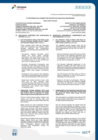 PT Pertamina Hulu Energi 663 2022The original consolidated financial statements included herein are in the Indonesian language.PT PERTAMINA HULU ENERGI TBK DAN ENTITAS ANAK/AND SUBSIDIARIES Daftar 5/224 ScheduleCATATAN ATAS LAPORAN KEUANGANKONSOLIDASIANTanggal 31 Desember 2022, 2021, dan 2020serta Untuk Tahun yang Berakhir padaTanggal-Tanggal 31 Desember 2020, 2021, dan 2020(Disajikan dalam ribuan dolar Amerika Serikat, kecuali dinyatakan lain)NOTES TO THE CONSOLIDATEDFINANCIAL STATEMENTSAs of December 31, 2022, 2021, and 2020and For The Years Ended December 31, 2022, 2021, and 2020 (Expressed in thousands of United States dollars,unless otherwise stated)45. PERJANJIAN, KOMITMEN DAN KONTINJENSI PENTING (lanjutan)45. SIGNIFICANT AGREEMENTS, COMMITMENTS AND CONTINGENCIES (continued)k. Tarif Pemanfaatan Kilang LNG Badak untuk Kontrak Penjualan Western Buyers (%u201cWBX%u201d) dan Nusantara Regas (%u201cNR%u201d) (lanjutan)k. The Utilization Tariff of Badak LNG Plant for Western Buyers (%u201cWBX%u201d) and Nusantara Regas (%u201cNR%u201d) Sales Contracts (continued)Proses negosiasi antara PHM dan Pemerintah masih terus berlangsung yang dilakukan melalui beberapa pertemuan dan korespondensi, diantaranya yang berlangsung sampai dengan 2022: (lanjutan)The negotiation process between PHM and the Government is still on going through several meetings and correspondences that was held until 2022, i.e.: (continued)- Serangkaian meeting rekonsiliasi jumlah tagihan dan klausul dalam perjanjian pembayaran yang telah dilakukan oleh PHM, SKK Migas dan LMAN pada tanggal 7-8, 23 September 2022, 8, 15, dan 30 November 2022, serta 13 Desember 2022.- Series of meetings to reconcile the amount of bills and clauses in the setlement agreement have been carried out by PHM, SKK Migas and LMAN on September 7-8, 23, 2022, November 8, 15, and 30, 2022, and December 13, 2022.- Perjanjian Penyelesaian Pembayaran atas Pemanfaatan Aktiva Kilang LNG Badak untuk Kontrak Penjualan LNG WBX dan NR telah ditandatangani oleh Direktur PHM dan Direktur Utama LMAN pada tanggal 15 Desember 2022.- The Payment Settlement Agreement for the Utilization of Badak LNG Plant Assets for the WBX and NR LNG Sales Contract was signed by the Director of PHM and the President Director of LMAN on December 15, 2022.- Pembayaran tahap pertama telah dilakukan oleh PHM kepada LMAN tanggal 23 Desember 2022 sebesar AS$9.869.419,79 (nilai penuh).- The first payment has been made by PHM to LMAN on December 23, 2022 in the amount of US$9,869,419.79 (full amount).- Berdasarkan keadaan tersebut di atas, maka PHM saat ini telah mengakui biaya pemanfaatan kilang LNG Badak untuk kontrak penjualan WBX-NR dalam laporan keuangan terkonsolidasi yang berakhir pada tanggal 31 Desember 2022.- Based on the above circumstances, PHM has recorded a provision for the utilization of Badak LNG plant for WBX-NR in the consolidated financial statements ended December 31, 2022.l. Pelaksanaan Putusan Arbitrase (ICC) yangdimenangkan oleh PT Pertamina Hulu Energi Raja Tempirai (PHE RT) terhadap PT Golden Spike Energy Indonesia (GSEI) pada tahun 2017 l. Implementation of the Arbitration Award (ICC) won by PT Pertamina Hulu Energi Raja Tempirai (PHE RT) against PT Golden Spike Energy Indonesia (GSEI) in 2017Perkara ini terkait adanya gugatan arbitrase yang diajukan oleh PHE RT terhadap GSEI untuk pemenuhan kewajiban keuangan GSEI di Blok WK Raja Tempirai.This case relates to an arbitration lawsuit filed by PHE RT against GSEI to fulfill GSEI's financial obligations in the Raja Tempirai Working Area. Majelis Tribunal ICC telah menjatuhkan Putusan Third & Final Award pada tanggal 17 Februari 2017, dengan amar, antara lain: PHE berhak melakukan forfeit entitlement GSEI, GSEI harus membayar AS$19.400 beserta bunga, GSEI harus membayar ganti rugi sebesar AS$8.500 beserta bunga dan GSEI harus membayar biaya arbitrase sebesar EUR732,409 (nilai penuh).The ICC Tribunal Assembly has handed down the Third & Final Award Decision on February 17, 2017, with a ruling, among others: PHE has the right to forfeit GSEI entitlement, GSEI must pay US$19,400 along with interest, GSEI must pay compensation of US$8,500 with interest and GSEI must pay an arbitration fee of EUR732,409 (full amount).PHE RT telah mendaftarkan Putusan di Pengadilan Negeri Jakarta Pusat, dan telah diperoleh penetapan eksekuatur, selanjutnya telah dilakukan aanmaning terhadap PT GSEI namun GSEI tidak hadir. Belakangan diketahui, GSEI telah dinyatakan pailit berdasarkan Putusan PK Mahkamah Agung.PHE RT has registered the Decision at the Central Jakarta District Court, and has obtained an exequatural determination, then an investigation has been conducted against PT GSEI but GSEI is not present. It was later discovered that GSEI had been declared bankrupt based on the PK Decision of the Supreme Court.