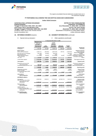 PT Pertamina Hulu Energi 667 2022The original consolidated financial statements included herein are in the Indonesian language.PT PERTAMINA HULU ENERGI TBK DAN ENTITAS ANAK/AND SUBSIDIARIES Daftar 5/228 ScheduleCATATAN ATAS LAPORAN KEUANGANKONSOLIDASIANTanggal 31 Desember 2022, 2021, dan 2020serta Untuk Tahun yang Berakhir padaTanggal-Tanggal 31 Desember 2020, 2021, dan 2020(Disajikan dalam ribuan dolar Amerika Serikat, kecuali dinyatakan lain)NOTES TO THE CONSOLIDATEDFINANCIAL STATEMENTSAs of December 31, 2022, 2021, and 2020and For The Years Ended December 31, 2022, 2021, and 2020 (Expressed in thousands of United States dollars,unless otherwise stated)46. INFORMASI SEGMEN (lanjutan) 46. SEGMENT INFORMATION (continued)2. Operasi lainnya (lanjutan) 2. Other operations (continued) 31 Desember/December 31, 2020 Eksplorasi dan produksi minyak Jumlah dan gas/ sebelum Exploration for eliminasi/ and production Jasa/ Total before Eliminasi/ Jumlah/ of oil and gas Services elimination Elimination Total PENDAPATAN REVENUESPendapatan 7.727.786 751.384 8.479.170 (405.376) 8.073.794 Revenues Beban segmen Segment expenses Beban pokok pendapatan (3.263.121) (594.209) (3.857.330) 397.574 (3.459.756) Cost of revenues Salaries and employees%u2019Biaya gaji upah dan tunjangan (201.389) (22.395) (223.784) - (223.784) benefitsBiaya pemeliharaan (333) - (333) - (333) Repairs and maintenance Beban depresiasi, deplesi (2.131.089) (82.870) (2.213.959) 44.458 (2.169.501) Depreciation, depletion, and dan amortisasi amotisation expensesLain - lain (144.366) (8.785) (153.151) - (153.151) Others Jumlah beban segmen (5.740.298) (708.259) (6.448.557) 442.032 (6.006.525) Total segment expenses Laba segmen 1.987.488 43.125 2.030.613 36.656 2.067.269 Segment profit Penyisihan penurunan nilai Provision for impairment of aset non-keuangan (662.684) - (662.684) - (662.684) non-financial assets Pendapatan/(beban) lain-lain, neto 554.748 3.696 558.444 (542.237) 16.207 Other income/(expense), netLaba operasi 1.879.552 46.821 1.926.373 (505.581) 1.420.792 Operating profit Penghasilan keuangan 41.553 4.368 45.921 - 45.921 Finance income Beban keuangan (148.872) (16.203) (165.075) - (165.075) Finance costs Keuntungan/(kerugian) selisih Foreign exchange kurs, neto 10.106 (2.840) 7.266 (5.929) 1.337 gain/(loss), net Laba sebelum Profit before pajak penghasilan 1.782.339 32.146 1.814.485 (511.510) 1.302.975 income taxesINFORMASI LAINNYA OTHER INFORMATION Aset segmen 49.925.528 1.098.315 51.023.843 (49.784.713) 1.239.130 Segment assets Aset Perusahaan dan entitas Unallocated assets anak yang tidak dapat of the Company dialokasikan 24.866.029 - 24.866.029 - 24.866.029 and subsidiaries Total aset yang Total consolidated dikonsolidasikan 74.791.557 1.098.315 75.889.872 (49.784.713) 26.105.159 assetsLiabilitas segmen 35.744.061 533.633 36.277.694 (49.195.430) (12.917.736) Segment liabilitiesLiabilitas Perusahaan dan Unallocated liabilities entitas anak yang tidak dapat of the Company dialokasikan 24.840.905 - 24.840.905 - 24.840.905 and subsidiaries Total liabilitas yang Total consolidated dikonsolidasikan 60.584.966 533.633 61.118.599 (49.195.430) 11.923.169 liabilities