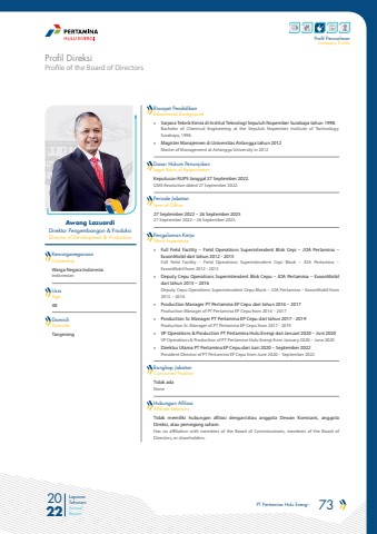 PT Pertamina Hulu Energi 73 2022Laporan TahunanAnnual ReportProfil PerusahaanCompany ProfileProfile of the Board of DirectorsProfil DireksiAwang LazuardiDirektur Pengembangan & Produksi Director of Development & ProductionKewarganegaraanCitizenshipRiwayat PendidikanEducational BackgroundDasar Hukum PenunjukanLegal Basis of AppointmentPeriode JabatanTerm of OfficeHubungan AfiliasiAffiliate RelationsPengalaman KerjaWork ExperienceRangkap JabatanConcurrent PositionUsiaAgeDomisili DomicileWarga Negara Indonesia Indonesian%u00bb Sarjana Teknik Kimia di Institut Teknologi Sepuluh Nopember Surabaya tahun 1998.Bachelor of Chemical Engineering at the Sepuluh Nopember Institute of Technology,Surabaya, 1998.%u00bb Magister Manajemen di Universitas Airlangga tahun 2012Master of Management at Airlangga University in 2012Keputusan RUPS tanggal 27 September 2022.GMS Resolution dated 27 September 2022.27 September 2022 %u2013 26 September 202527 September 2022 %u2013 26 September 2025Tidak memiliki hubungan afiliasi dengan/atau anggota Dewan Komisaris, anggota Direksi, atau pemegang saham.Has no affiliation with members of the Board of Commissioners, members of the Board of Directors, or shareholders.%u00bb Full Field Facility %u2013 Field Operations Superintendent Blok Cepi %u2013 JOA Pertamina %u2013ExxonMobil dari tahun 2012 - 2015Full Field Facility %u2013 Field Operations Superintendent Cepi Block %u2013 JOA Pertamina %u2013ExxonMobil from 2012 - 2015%u00bb Deputy Cepu Operations Superintendent Blok Cepu %u2013 JOA Pertamina %u2013 ExxonMobildari tahun 2015 %u2013 2016Deputy Cepu Operations Superintendent Cepu Block %u2013 JOA Pertamina %u2013 ExxonMobil from 2015 %u2013 2016%u00bb Production Manager PT Pertamina EP Cepu dari tahun 2016 %u2013 2017Production Manager of PT Pertamina EP Cepu from 2016 %u2013 2017%u00bb Production Sr. Manager PT Pertamina EP Cepu dari tahun 2017 - 2019Production Sr. Manager of PT Pertamina EP Cepu from 2017 - 2019%u00bb VP Operations & Production PT Pertamina Hulu Energi dari Januari 2020 %u2013 Juni 2020VP Operations & Production of PT Pertamina Hulu Energi from January 2020 %u2013 June 2020%u00bb Direktur Utama PT Pertamina EP Cepu dari Juni 2020 %u2013 September 2022President Director of PT Pertamina EP Cepu from June 2020 %u2013 September 2022Tidak adaNone48Tangerang