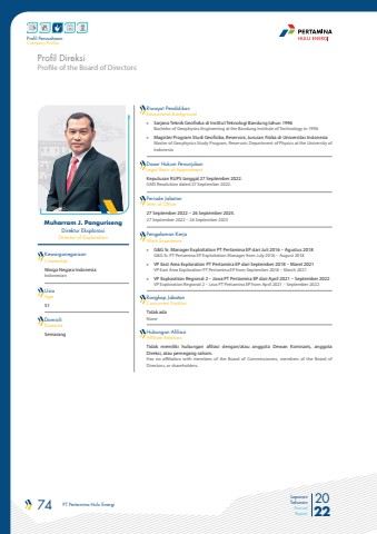 74 PT Pertamina Hulu Energi 2022Laporan TahunanAnnual ReportProfil PerusahaanCompany ProfileProfile of the Board of DirectorsProfil DireksiMuharram J. PangurisengDirektur EksplorasiDirector of ExplorationKewarganegaraanCitizenshipRiwayat PendidikanEducational BackgroundDasar Hukum PenunjukanLegal Basis of AppointmentPeriode JabatanTerm of OfficeHubungan AfiliasiAffiliate RelationsPengalaman KerjaWork ExperienceRangkap JabatanConcurrent PositionUsiaAgeDomisili DomicileWarga Negara Indonesia Indonesian%u00bb Sarjana Teknik Geofisika di Institut Teknologi Bandung tahun 1996Bachelor of Geophysics Engineering at the Bandung Institute of Technology in 1996%u00bb Magister Program Studi Geofisika, Reservoir, Jurusan Fisika di Universitas Indonesia Master of Geophysics Study Program, Reservoir, Department of Physics at the University of IndonesiaKeputusan RUPS tanggal 27 September 2022.GMS Resolution dated 27 September 2022.27 September 2022 %u2013 26 September 2025.27 September 2022 %u2013 26 September 2025Tidak memiliki hubungan afiliasi dengan/atau anggota Dewan Komisaris, anggota Direksi, atau pemegang saham.Has no affiliation with members of the Board of Commissioners, members of the Board of Directors, or shareholders.%u00bb G&G Sr. Manager Exploitation PT Pertamina EP dari Juli 2016 %u2013 Agustus 2018G&G Sr. PT Pertamina EP Exploitation Manager from July 2016 %u2013 August 2018%u00bb VP East Area Exploration PT Pertamina EP dari September 2018 %u2013 Maret 2021VP East Area Exploration PT Pertamina EP from September 2018 %u2013 March 2021%u00bb VP Exploration Regional 2 %u2013 Jawa PT Pertamina EP dari April 2021 %u2013 September 2022VP Exploration Regional 2 %u2013 Java PT Pertamina EP from April 2021 %u2013 September 2022Tidak adaNone51Semarang
