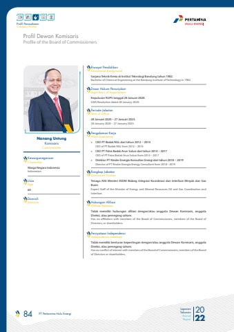 84 PT Pertamina Hulu Energi 2022Laporan TahunanAnnual ReportProfil PerusahaanCompany ProfileProfile of the Board of CommissionersProfil Dewan KomisarisNanang UntungKomisaris CommissionerKewarganegaraanCitizenshipRiwayat PendidikanEducational BackgroundDasar Hukum PenunjukanLegal Basis of AppointmentPeriode JabatanTerm of OfficeHubungan AfiliasiAffiliate RelationsPengalaman KerjaWork ExperienceRangkap JabatanConcurrent PositionUsiaAgeDomisili DomicileWarga Negara Indonesia IndonesianSarjana Teknik Kimia di Institut Teknologi Bandung tahun 1982.Bachelor of Chemical Engineering at the Bandung Institute of Technology in 1982.Keputusan RUPS tanggal 28 Januari 2020.GMS Resolution dated 28 January 2020.28 Januari 2020 %u2013 27 Januari 2023.28 January 2020 %u2013 27 January 2023.Tidak memiliki hubungan afiliasi dengan/atau anggota Dewan Komisaris, anggota Direksi, atau pemegang saham.Has no affiliation with members of the Board of Commissioners, members of the Board of Directors, or shareholders.%u00bb CEO PT Badak NGL dari tahun 2012 %u2013 2014CEO of PT Badak NGL from 2012 %u2013 2014%u00bb CEO PT Patra Badak Arun Solusi dari tahun 2014 %u2013 2017CEO of PT Patra Badak Arun Solusi from 2014 %u2013 2017%u00bb Direktur PT Rinder Energia Konsultan Energi dari tahun 2018 %u2013 2019Director of PT Rinder Energia Energy Consultant from 2018 - 2019Tenaga Ahli Menteri ESDM Bidang Integrasi Koordinasi dan Interface Minyak dan Gas Bumi.Expert Staff of the Minister of Energy and Mineral Resources Oil and Gas Coordination and Interface.64Pernyataan IndependensiIndependence StatementTidak memiliki benturan kepentingan dengan/atau anggota Dewan Komisaris, anggota Direksi, atau pemegang saham.Has no conflict of interest with members of the Board of Commissioners, members of the Board of Directors or shareholders.
