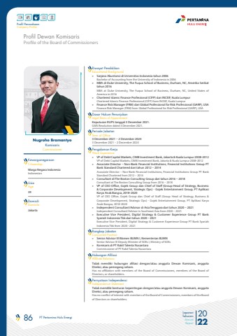 86 PT Pertamina Hulu Energi 2022Laporan TahunanAnnual ReportProfil PerusahaanCompany ProfileProfile of the Board of CommissionersProfil Dewan KomisarisNugroho BramantyoKomisaris CommissionerKewarganegaraanCitizenshipRiwayat PendidikanEducational BackgroundDasar Hukum PenunjukanLegal Basis of AppointmentPeriode JabatanTerm of OfficeHubungan AfiliasiAffiliate RelationsPengalaman KerjaWork ExperienceRangkap JabatanConcurrent PositionUsiaAgeDomisili DomicileWarga Negara Indonesia Indonesian%u00bb Sarjana Akuntansi di Universitas Indonesia tahun 2006Bachelor of Accounting from the University of Indonesia in 2006%u00bb MBA di Duke University, The Fuqua School of Business, Durham, NC, Amerika Serikat tahun 2016MBA at Duke University, The Fuqua School of Business, Durham, NC, United States ofAmerica in 2016%u00bb Chartered Islamic Finance Professional (CIFP) dari INCEIF, Kuala LumpurChartered Islamic Finance Professional (CIFP) from INCEIF, Kuala Lumpur%u00bb Finance Risk Manager (FRM) dari Global Professional for Risk Professional (GARP), USAFinance Risk Manager (FRM) from Global Professional for Risk Professional (GARP), USAKeputusan RUPS tanggal 3 Desember 2021.GMS Resolution dated 3 December 2021.3 Desember 2021 %u2013 2 Desember 20243 December 2021 %u2013 2 December 2024Tidak memiliki hubungan afiliasi dengan/atau anggota Dewan Komisaris, anggota Direksi, atau pemegang saham.Has no affiliation with members of the Board of Commissioners, members of the Board of Directors, or shareholders.%u00bb VP of Debt Capital Markets, CIMB Investment Bank, Jakarta & Kuala Lumpur 2008-2012VP of Debt Capital Markets, CIMB Investment Bank, Jakarta & Kuala Lumpur 2008-2012%u00bb Associate Director %u2013 Non-Bank Financial Institutions, Financial Institutions Group PTBank Standard Chartered dari tahun 2012 %u2013 2014Associate Director %u2013 Non-Bank Financial Institutions, Financial Institutions Group PT BankStandard Chartered from 2012 %u2013 2014%u00bb Consultant di The Boston Consulting Group dari tahun 2016 %u2013 2018Consultant at The Boston Consulting Group from 2016 %u2013 2018%u00bb VP of CEO Office, Gojek Group dan Chief of Staff (Group Head of Strategy, Business& Corporate Development, Strategic Ops) - Gojek Entertainment Group, PT AplikasiKarya Anak Bangsa, 2018-2020VP of CEO Office, Gojek Group dan Chief of Staff (Group Head of Strategy, Business &Corporate Development, Strategic Ops) - Gojek Entertainment Group, PT Aplikasi KaryaAnak Bangsa, 2018-2020%u00bb Independent Consultant/Advisor di Asia Tenggara dari tahun 2020 %u2013 2021Independent Consultant/Advisor in Southeast Asia from 2020 %u2013 2021%u00bb Executive Vice President, Digital Strategy & Customer Experience Group PT BankSyariah Indonesia Tbk dari tahun 2020 %u2013 2021Executive Vice President, Digital Strategy & Customer Experience Group PT Bank SyariahIndonesia Tbk from 2020 - 2021%u00bb Senior Advisor III Wamen BUMN I, Kementerian BUMNSenior Advisor III Deputy Minister of SOEs I, Ministry of SOEs%u00bb Komisaris di PT Rakit Talenta NusantaraCommissioner of PT Rakit Talenta Nusantara39JakartaPernyataan IndependensiIndependence StatementTidak memiliki benturan kepentingan dengan/atau anggota Dewan Komisaris, anggota Direksi, atau pemegang saham.Has no conflict of interest with members of the Board of Commissioners, members of the Board of Directors or shareholders.