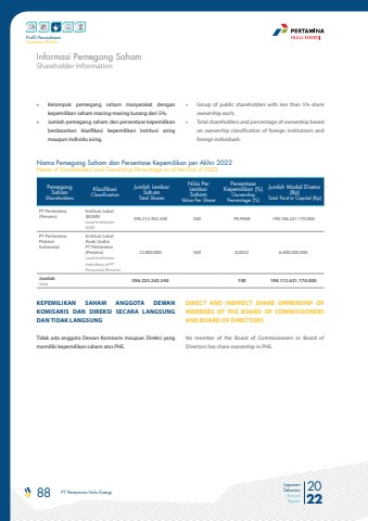 88 PT Pertamina Hulu Energi 2022Laporan TahunanAnnual ReportProfil PerusahaanCompany Profile%u00bb Kelompok pemegang saham masyarakat dengankepemilikan saham masing-masing kurang dari 5%; %u00bb Jumlah pemegang saham dan persentase kepemilikanberdasarkan klasifikasi kepemilikan institusi asingmaupun individu asing.KEPEMILIKAN SAHAM ANGGOTA DEWAN KOMISARIS DAN DIREKSI SECARA LANGSUNG DAN TIDAK LANGSUNGTidak ada anggota Dewan Komisaris maupun Direksi yang memiliki kepemilikan saham atas PHE.%u00bb Group of public shareholders with less than 5% shareownership each;%u00bb Total shareholders and percentage of ownership basedon ownership classification of foreign institutions andforeign individuals.DIRECT AND INDIRECT SHARE OWNERSHIP OF MEMBERS OF THE BOARD OF COMMISSIONERS AND BOARD OF DIRECTORS No member of the Board of Commissioners or Board of Directors has share ownership in PHE.Nama Pemegang Saham dan Persentase Kepemilikan per Akhir 2022Name of Shareholders and Ownership Percentage as of the End of 2022Pemegang SahamShareholdersKlasifikasiClassificationJumlah LembarSahamTotal SharesNilai Per LembarSahamValue Per SharePersentaseKepemilikan (%)Ownership Percentage (%)Jumlah Modal Disetor (Rp)Total Paid-in Capital (Rp)PT Pertamina (Persero)Institusi Lokal(BUMNLocal Institution (SOE)396.212.442.340 500 99,9968 198.106.221.170.000PT Pertamina PedeveIndonesiaInstitusi LokalAnak Usaha PT Pertamina (Persero)Local InstitutionSubsidiary of PT Pertamina (Persero)12.800.000 500 0,0032 6.400.000.000Jumlah Total 396.225.242.340 100 198.112.621.170.000Shareholder InformationInformasi Pemegang Saham