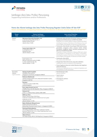 PT Pertamina Hulu Energi 91 2022Laporan TahunanAnnual ReportProfil PerusahaanCompany ProfileNama dan Alamat Lembaga dan/atau Profesi Penunjang Kegiatan Usaha Selain AP dan KAPNames and Addresses of Supporting Institutions and/or Professions for Business Activities Other than AP and KAPPeranRoleNama LembagaName of OrganizationJasa yang DiberikanServices ProvidedNotarisNotaryMarianne Vincentia Hamdani, S.H.Jl. Boulevard Raya Blok K4 No. 3Kelapa Gading Permai Jakarta Utara 14240%u00bb Pembuatan akta pendirian Perseroan Terbatas termasuk pengurusan SK Kemenhum & HAM RI dan BNRI. Preparation of a Limited Liability Company establishment deed, including the issuance of the Decree of the Ministry of Law and Human Rights of the Republic of Indonesia and State Gazette.%u00bb Pembuatan Akta Risalah Acara Rapat (PKR) baik tentang perubahan Anggaran Dasar maupun bukan terkaitPerubahan Anggaran Dasar, termasuk pengurusan SKMenhum & HAM RI dan BNRI. Preparation of Deeds of Minutes of Meeting (PKR) both related and unrelated to amendments to the Articles of Association,including the issuance of the Decree of the Ministry of Law and Human Rights of the Republic of Indonesia and State Gazette. %u00bb Pembuatan Akta RUPS. The creation of the GMS Deed.%u00bb Pengecekan Nama Perseroan yang akan didirikan. Checking the names of Companies to be established.%u00bb Proses legalisasi dokumen terkait likuidasi dan legalisasi dokumen lainnya. The document legalization process in relation to liquidation and the legalization of other documentsLenny Janis Ishak, S.H.Jl. Hanglekir IX No. 1Kebayoran Baru Jakarta Selatan 12120Aulia Taufani, S.H.Menara Sudirman Lantai 18 ABD, Jl. Jend. Sudirman Kav. 60, Jakarta Selatan 12190Konsultan HukumLegal ConsultantHerbert Smith Freehills50 Raffles Place #24-01, Singapore Land Tower, Singapore 048623%u00bb Pendampingan saksi.Witness assistance. %u00bb Opini hukum.Legal opinion.%u00bb Penanganan perkara.Case handling.Debrauw Westbroek28 Maxwell Road #04-22/23, Maxwell Chambers Suites, Singapore 069120Dentons1 Fleet PI, London EC4M 7WS, United KingdomK & L Gates Straits Law LLC9 Raffles Place #32-00, Republic Plaza, Singapore 048619Ashurst LLPLevel 11, 5 Martin Place, Sydney NSW 2000HHP Law FirmPacific Century Place 35th Floor, Sudirman Central Business District Lot 10, Jl. jend. Sudirman 52-53, Jakarta Selatan 12190Baker McKenzie Wong & Leow8 Marina Boulevard #05-01, Marina Bay Financial Centre Tower 1, Singapore 018981Ginting & ReksodiputroThe Energy Building 15th Floor, Sudirman Central Business District Lot 11A, Jl. Jend. Sudirman Kav 52-53, Jakarta Selatan 12190Allen & Overy50 Collyer Quay, #09-01 OUE Bayfront, Singapore 049321Supporting Institutions and/or ProfessionsLembaga dan/atau Profesi Penunjang