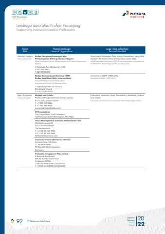 92 PT Pertamina Hulu Energi 2022Laporan TahunanAnnual ReportProfil PerusahaanCompany ProfilePeranRoleNama LembagaName of OrganizationJasa yang DiberikanServices ProvidedAkuntan NegaraState AccountantBadan Pengawas Keuangan danPembangunan Bidang Akuntan NegaraState Accountant Sector Development and Finance Supervisory AgencyJl. Pramuka No. 33 Jakarta 13120T: 021 858 4867,F: 021 85906404Assessment Penerapan Tata Kelola Perusahaan yang Baik (GCG) PT Pertamina Hulu Energi Tahun buku 2022.Good Corporate Governance (GCG) Implementation Assessment of PT Pertamina Hulu Energi for the 2022 fiscal yearBadan Standardisasi Nasional (BSN)Badan Sertifikasi Mutu InternasionalNational Standardization Body (BSN)International Quality Certification BodyJl. Raya Bogor No. 19 KM 33,5 Cimanggis, DepokT: (+62-21) 8740202Surveillance SMAP 37001:2016Surveillance SMAP 37001:2016Agen KorporasiCorporate AgentMaples and CalderPO Box 309 Ugland House Grand CaymanKY1-1104 Cayman IslandsT: +1 345 949 8066F: +1 345 949 8080www.maplesandcalder.comDokumen korporasi Anak Perusahaan berbadan hukum luar negeri.Corporate documents of Subsidiaries with foreign legal entities.CT CorporationThe Corporation Trust Company1209 Orange Street Wilmington, DE 19801Vistra Management Services (Netherlands) B.V.Herikerbergweg 881101CM AmsterdamThe NetherlandsT: +31 (0) 88 560 9950F: +31 (0) 88 560 9960Netherlands@vistra.comOcorion Services (Bermuda) LimitedVictoria Place, 5th Floor, 31 Victoria StreetPO Box HM 1624, Hamilton, BermudaPortcullis (Singapore) Pte Limited6 Temasek Boulevard#09-05 Suntec Tower FourSingapore 03986T: +65 (0) 6496 0496 / 6836 9555 F: +65 (0) 6538 6585 / 6333 6830Supporting Institutions and/or ProfessionsLembaga dan/atau Profesi Penunjang