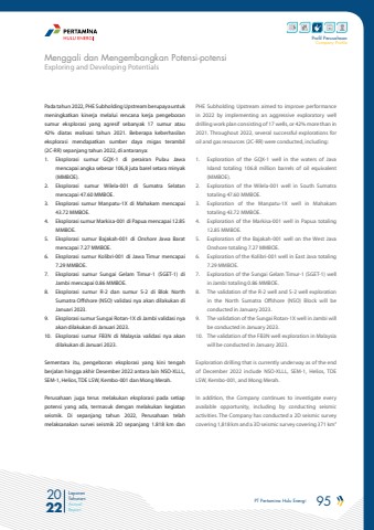 PT Pertamina Hulu Energi 95 2022Laporan TahunanAnnual ReportProfil PerusahaanCompany ProfilePada tahun 2022, PHE Subholding Upstream berupaya untuk meningkatkan kinerja melalui rencana kerja pengeboran sumur eksplorasi yang agresif sebanyak 17 sumur atau 42% diatas realisasi tahun 2021. Beberapa keberhasilan eksplorasi mendapatkan sumber daya migas terambil (2C-RR) sepanjang tahun 2022, di antaranya: 1. Eksplorasi sumur GQX-1 di perairan Pulau Jawamencapai angka sebesar 106,8 juta barel setara minyak (MMBOE). 2. Eksplorasi sumur Wilela-001 di Sumatra Selatanmencapai 47.60 MMBOE.3. Eksplorasi sumur Manpatu-1X di Mahakam mencapai43.72 MMBOE.4. Eksplorasi sumur Markisa-001 di Papua mencapai 12.85 MMBOE.5. Eksplorasi sumur Bajakah-001 di Onshore Jawa Baratmencapai 7.27 MMBOE.6. Eksplorasi sumur Kolibri-001 di Jawa Timur mencapai7.29 MMBOE.7. Eksplorasi sumur Sungai Gelam Timur-1 (SGET-1) diJambi mencapai 0.86 MMBOE.8. Eksplorasi sumur R-2 dan sumur S-2 di Blok NorthSumatra Offshore (NSO) validasi nya akan dilakukan diJanuari 2023. 9. Eksplorasi sumur Sungai Rotan-1X di Jambi validasi nya akan dilakukan di Januari 2023.10. Eksplorasi sumur FB3N di Malaysia validasi nya akandilakukan di Januari 2023.Sementara itu, pengeboran eksplorasi yang kini tengah berjalan hingga akhir Desember 2022 antara lain NSO-XLLL, SEM-1, Helios, TDE LSW, Kembo-001 dan Mong Merah.Perusahaan juga terus melakukan eksplorasi pada setiap potensi yang ada, termasuk dengan melakukan kegiatan seismik. Di sepanjang tahun 2022, Perusahaan telah melaksanakan survei seismik 2D sepanjang 1.818 km dan PHE Subholding Upstream aimed to improve performance in 2022 by implementing an aggressive exploratory well drilling work plan consisting of 17 wells, or 42% more than in 2021. Throughout 2022, several successful explorations for oil and gas resources (2C-RR) were conducted, including:1. Exploration of the GQX-1 well in the waters of JavaIsland totaling 106.8 million barrels of oil equivalent(MMBOE).2. Exploration of the Wilela-001 well in South Sumatratotaling 47.60 MMBOE.3. Exploration of the Manpatu-1X well in Mahakamtotaling 43.72 MMBOE.4. Exploration of the Markisa-001 well in Papua totaling12.85 MMBOE.5. Exploration of the Bajakah-001 well on the West JavaOnshore totaling 7.27 MMBOE.6. Exploration of the Kolibri-001 well in East Java totaling7.29 MMBOE.7. Exploration of the Sungai Gelam Timur-1 (SGET-1) wellin Jambi totaling 0.86 MMBOE.8. The validation of the R-2 well and S-2 well explorationin the North Sumatra Offshore (NSO) Block will beconducted in January 2023.9. The validation of the Sungai Rotan-1X well in Jambi will be conducted in January 2023.10. The validation of the FB3N well exploration in Malaysiawill be conducted in January 2023.Exploration drilling that is currently underway as of the end of December 2022 include NSO-XLLL, SEM-1, Helios, TDE LSW, Kembo-001, and Mong Merah.In addition, the Company continues to investigate every available opportunity, including by conducting seismic activities. The Company has conducted a 2D seismic survey covering 1,818 km and a 3D seismic survey covering 371 km2Exploring and Developing PotentialsMenggali dan Mengembangkan Potensi-potensi