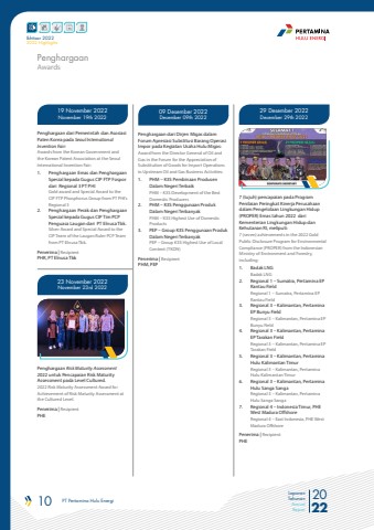 10 PT Pertamina Hulu Energi 2022Laporan TahunanAnnual ReportIkhtisar 20222022 HighlightsPenghargaan Risk Maturity Assessment 2022 untuk Pencapaian Risk Maturity Assessment pada Level Cultured.2022 Risk Maturity Assessment Award for Achievement of Risk Maturity Assessment at the Cultured Level.7 (tujuh) pencapaian pada Program Penilaian Peringkat Kinerja Perusahaan dalam Pengelolaan Lingkungan Hidup (PROPER) Emas tahun 2022 dari Kementerian Lingkungan Hidup dan Kehutanan RI, meliputi: 7 (seven) achievements in the 2022 Gold Public Disclosure Program for Environmental Compliance (PROPER) from the Indonesian Ministry of Environment and Forestry, including: 1. Badak LNGBadak LNG2. Regional 1 %u2013 Sumatra, Pertamina EP Rantau FieldRegional 1 %u2013 Sumatra, Pertamina EP Rantau Field3. Regional 3 %u2013 Kalimantan, Pertamina EP Bunyu FieldRegional 3 %u2013 Kalimantan, Pertamina EP Bunyu Field4. Regional 3 %u2013 Kalimantan, Pertamina EP Tarakan FieldRegional 3 %u2013 Kalimantan, Pertamina EP Tarakan Field5. Regional 3 %u2013 Kalimantan, Pertamina Hulu Kalimantan TimurRegional 3 %u2013 Kalimantan, Pertamina Hulu Kalimantan Timur6. Regional 3 %u2013 Kalimantan, Pertamina Hulu Sanga SangaRegional 3 %u2013 Kalimantan, Pertamina Hulu Sanga Sanga7. Regional 4 %u2013 Indonesia Timur, PHE West Madura OffshoreRegional 4 %u2013 East Indonesia, PHE West Madura OffshorePenerima | RecipientPHEPenerima | RecipientPHE23 November 2022November 23rd 202229 Desember 2022December 29th 2022Penghargaan dari Pemerintah dan Asosiasi Paten Korea pada Seoul International Invention Fair:Awards from the Korean Government and the Korean Patent Association at the Seoul International Invention Fair:1. Penghargaan Emas dan Penghargaan Spesial kepada Gugus CIP FTP Fospor dari Regional 3 PT PHI Gold award and Special Award to the CIP FTP Phosphorus Group from PT PHI%u2019s Regional 32. Penghargaan Perak dan Penghargaan Spesial kepada Gugus CIP Tim PCP Penguasa Laugan dari PT Elnusa Tbk.Silver Award and Special Award to the CIP Team of the Laugan Ruler PCP Team from PT Elnusa Tbk.Penghargaan dari Dirjen Migas dalam Forum Apresiasi Substitusi Barang Operasi Impor pada Kegiatan Usaha Hulu Migas:Award from the Director General of Oil and Gas in the Forum for the Appreciation of Substitution of Goods for Import Operations in Upstream Oil and Gas Business Activities:1. PHM %u2013 K3S Pembinaan Produsen Dalam Negeri TerbaikPHM %u2013 K3S Development of the Best Domestic Producers2. PHM %u2013 K3S Penggunaan Produk Dalam Negeri TerbanyakPHM %u2013 K3S Highest Use of Domestic Products3. PEP %u2013 Group K3S Penggunaan Produk Dalam Negeri TerbanyakPEP %u2013 Group K3S Highest Use of Local Content (TKDN) Penerima | RecipientPHR, PT Elnusa Tbk Penerima | RecipientPHM, PEP19 November 2022November 19th 202209 Desember 2022Desember 09th 2022AwardsPenghargaan