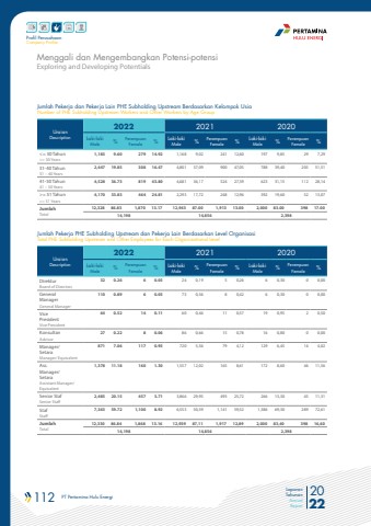 112 PT Pertamina Hulu Energi 2022Laporan TahunanAnnual ReportProfil PerusahaanCompany ProfileUraianDescription2022 2021 2020Laki-lakiMale % PerempuanFemale % Laki-lakiMale % PerempuanFemale % Laki-lakiMale % PerempuanFemale %<= 30 Tahun<= 30 Years1,183 9.60 279 14.92 1,168 9,02 241 12,60 197 9,85 29 7,2931-40 Tahun31 %u2013 40 Years2,447 19.85 308 16.47 4,801 37,09 900 47,05 788 39,40 205 51,5141-50 Tahun41 %u2013 50 Years4,528 36.73 819 43.80 4,681 36,17 524 27,39 623 31,15 112 28,14>= 51 Tahun>= 51 Years4,170 33.83 464 24.81 2,293 17,72 248 12,96 392 19,60 52 13,07JumlahTotal12,328 86.83 1,870 13.17 12,943 87.00 1,913 13.00 2,000 83.00 398 17.0014,198 14,856 2,398Jumlah Pekerja dan Pekerja Lain PHE Subholding Upstream Berdasarkan Kelompok Usia Number of PHE Subholding Upstream Workers and Other Workers by Age Group UraianDescription2022 2021 2020Laki-lakiMale % PerempuanFemale % Laki-lakiMale % PerempuanFemale % Laki-lakiMale % PerempuanFemale %DirekturBoard of Directors32 0.26 6 0.05 24 0,19 5 0,26 6 0,30 0 0,00GeneralManagerGeneral Manager110 0.89 6 0.05 73 0,56 8 0,42 6 0,30 0 0,00VicePresidentVice President64 0.52 14 0.11 60 0,46 11 0,57 19 0,95 2 0,50KonsultanAdvisor27 0.22 8 0.06 86 0,66 15 0,78 16 0,80 0 0,00Manager/SetaraManager/ Equivalent871 7.06 117 0.95 720 5,56 79 4,12 129 6,45 16 4,02Ass.Manager/SetaraAssistant Manager/ Equivalent1,378 11.18 160 1.30 1,557 12,02 165 8,61 172 8,60 46 11,56Senior StafSenior Staff2,485 20.15 457 3.71 3,866 29,95 493 25,72 266 13,30 45 11,31StafStaff7,363 59.72 1,100 8.92 6,553 50,59 1,141 59,52 1,386 69,30 289 72,61JumlahTotal12,330 86.84 1,868 13.16 12,939 87,11 1,917 12,89 2,000 83,40 398 16,6014,198 14,856 2,398Jumlah Pekerja PHE Subholding Upstream dan Pekerja Lain Berdasarkan Level OrganisasiTotal PHE Subholding Upstream and Other Employees for Each Organizational Level Exploring and Developing PotentialsMenggali dan Mengembangkan Potensi-potensi