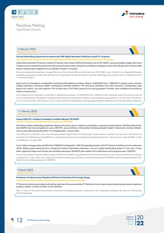 12 PT Pertamina Hulu Energi 2022Laporan TahunanAnnual ReportIkhtisar 20222022 Highlights2 Februari 2022February 2nd 202211 Februari 2022February 11th 20225 Maret 2022March 5th 2022Sinergi Subholding Upstream Pertamina dan SKK Migas Resmikan Fabrikasi Proyek YY LanjutanSynergy between Pertamina Subholding Upstream and SKK Migas Unveils Advanced YY Project FabricationSubholding Upstream Pertamina melalui Pertamina Hulu Energi Offshore Northwest Java (PHE ONWJ), yang merupakan bagian dari Zona 5 Regional Jawa Subholding Upstream Pertamina bersama Satuan Kerja Khusus Pelaksana Kegiatan Usaha Hulu Minyak dan Gas Bumi (SKK Migas) melaksanakan kegiatan first cut fabrikasi Proyek YY Lanjutan.Pertamina Subholding Upstream, through Pertamina Hulu Energi Offshore Northwest Java (PHE ONWJ), part of Zone 5 Java Regional Pertamina Subholding Upstream, and the Special Task Force for Upstream Oil and Gas Business Activities (SKK Migas) executed the first cut fabrication of the YY Advanced Project.Kerja sama ini diharapkan memberikan kontribusi penambahan produksi sebesar 2.000 BOPD dan 1 MMSCFD di kepala sumur, dimana lingkup pekerjaan utamanya adalah membangun kembali platform YYA (termasuk perbaikan dan deck extension), membangun pipa bawah laut sekitar 1 km dari platform YYA di lokasi baru (YYA1-RW) yang tie-in ke existing pipeline YYA-KLB, serta modifikasi brownfield di Platform KLB dan KLA.This collaboration is expected to contribute to additional production of 2,000 BOPD and 1 MMSCFD at the wellhead, where the primary scope of work is rebuilding the YYA platform (including repairs and deck extensions), building a subsea pipeline approximately 1 km from the YYA platform at a new location (YYA1 -RW) which is a tie-in to the existing YYA-KLB pipeline, and making brownfield modifications on the KLB and KLA Platforms.Sumur KRG-PA1 Catatkan Tambahan Produksi Minyak 709 BOPDKRG-PA1 Well Records Additional Oil Production of 709 BOPDPertamina melalui Subholding Upstream Regional Sumatra Zona 4 catatkan penambahan produksi minyak sebesar 709 Barel Minyak Per Hari (BOPD) dari hasil pengeboran sumur KRG-PA1 yang berlokasi di Kecamatan Rambang Kapak Tengah, Prabumulih, Sumatra Selatan. Sumur yang sekarang disebut KRG-15 ini ditajak pada 1 Januari 2022. The drilling of the KRG-PA1 well in the Rambang Kapak Tengah District of Prabumulih, South Sumatra resulted in an increase in Pertamina%u2019s oil production by 709 barrels per day (BOPD), as reported by the Zone 4 Sumatra Regional Subholding Upstream. The well, now called the KRG-15 well, was drilled on 1 January 2022.Sumur dibor menggunakan rig PDSI #32.2/N80UE-E berkapasitas 1.000 HP yang dioperasikan oleh PT Pertamina Drilling Services Indonesia (PDSI). Berkat upaya maksimal Zona 4 Regional Sumatra Subholding Upstream, sumur ini dapat diselesaikan dalam 31 hari, atau 14 hari lebih cepat dari target awal 45 hari, dan produksi mencapai 709 BOPD, atau sekitar 472% lebih besar dari prognosa awal 150 BOPD.The well was drilled using the 1,000-horsepower PDSI #32.2/N80UE-E rig operated by PT Pertamina Drilling Services Indonesia (PDSI). This well was completed in 31 days, which was 14 days faster than the initial target of 45 days, and production reached 709 BOPD, which was approximately 472% higher than the initial prognosis of 150 BOPD.Pemboran Perdana Sumur Eksplorasi Phoenix Pertamina Hulu Sanga SangaInitial Drilling of the Pertamina Hulu Sanga Sanga Phoenix Exploration WellPT Pertamina Hulu Energi selaku Subholding Upstream Pertamina melalui PT Pertamina Hulu Sanga Sanga melakukan pemboran eksplorasi perdana setelah 15 tahun terakhir di area tersebut.After 15 years, PT Pertamina Hulu Energi as Pertamina Subholding Upstream conducted its first exploration drilling in the area via PT Pertamina Hulu Sanga Sanga.Significant EventsPeristiwa Penting
