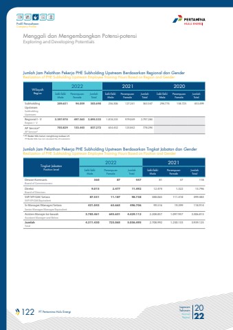 122 PT Pertamina Hulu Energi 2022Laporan TahunanAnnual ReportProfil PerusahaanCompany Profile* PT Badak NGL belum menghitung realisasi LH.PT Badak NGL has not calculated the LH realizationWilayahRegion2022 2021 2020Laki-lakiMalePerempuanFemaleJumlahTotalLaki-lakiMalePerempuanFemaleJumlahTotalLaki-lakiMalePerempuanFemaleJumlahTotalSubholdingUpstreamSubholding Upstream209.631 94.059 303.690 236.306 127.241 363.547 294.774 158.725 453.499Regional I - VRegion I - V3.397.970 497.563 3.895.533 1.818.235 979.049 2.797.284AP Service*AP Service*703.829 133.443 837.272 654.452 123.842 778.294Jumlah Jam Pelatihan Pekerja PHE Subholding Upstream Berdasarkan Regional dan GenderRealization of PHE Subholding Upstream Employee Training Hours Based on Region and GenderTingkat JabatanPosition Level2022 2021Laki-lakiMalePerempuanFemaleJumlahTotalLaki-lakiMalePerempuanFemaleJumlahTotalDewan Komisaris Board of Commissioners360 87 447 81 37 118DireksiBoard of Directors9.015 2.477 11.492 12.474 1.322 13.796SVP/VP/GM/ Setara SVP/VP/GM/Equivalent87.551 11.187 98.738 388.065 111.418 499.483Sr Manager/Manager/Setara Senior Manager/Manager/Equivalent431.043 65.663 496.706 99.516 19.399 118.914Asisten Manajer ke bawah Assistant Manager and Below3.783.461 645.651 4.429.112 2.208.857 1.097.957 3.306.813JumlahTotal4.311.430 725.065 5.036.495 2.708.992 1.230.133 3.939.125Jumlah Jam Pelatihan Pekerja PHE Subholding Upstream Berdasarkan Tingkat Jabatan dan GenderRealization of PHE Subholding Upstream Employee Training Hours Based on Position and GenderExploring and Developing PotentialsMenggali dan Mengembangkan Potensi-potensi