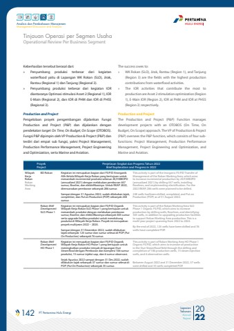 142 PT Pertamina Hulu Energi 2022Laporan TahunanAnnual ReportAnalisis dan Pembahasan ManajemenManagement Discussion and AnalysisOperational Review Per Business SegmentTinjauan Operasi per Segmen UsahaThe success owes to:%u00bb WK Rokan (SLO), Jirak, Rantau (Region 1), and Tanjung (Region 3) are the fields with the highest production contributions from waterflood activities.%u00bb The IOR activities that contribute the most to production are Asset 2 stimulation optimization (Region 1), E-Main IOR (Region 2), IOR at PHM and IOR at PHSS (Region 3) respectively.Production and ProjectThe Production and Project (P&P) Function manages development projects with an OTOBOS (On Time, On Budget, On Scope) approach. The VP of Production & Project (P&P) oversees the P&P function, which consists of four subfunctions: Project Management, Production Performance Management, Project Engineering and Optimization, and Marine and Aviation.Keberhasilan tersebut berasal dari:%u00bb Penyumbang produksi terbesar dari kegiatan waterflood yaitu di Lapangan WK Rokan (SLO), Jirak, Rantau (Regional 1) dan Tanjung (Regional 3).%u00a0%u00bb Penyumbang produksi terbesar dari kegiatan IOR diantaranya%u00a0Optimasi stimulasi Asset 2 (Regional 1), IOR E-Main (Regional 2), dan IOR di PHM dan IOR di PHSS (Regional 3).Production and Project Pengelolaan proyek pengembangan dijalankan Fungsi Production and Project (P&P) dan dijalankan dengan pendekatan target On Time, On Budget, On Scope (OTOBOS). Fungsi P&P dipimpin oleh VP Production & Project (P&P) dan terdiri dari empat sub fungsi, yakni Project Management, Production Performance Management, Project Engineering and Optimization, serta Marine and Aviation.ProyekProjectPenjelasan Singkat dan Progress Tahun 2022Brief Explanation and Progress in 2022Wilayah Kerja RokanRokan Working AreaBD Rokan Kegiatan ini merupakan bagian dari FS/FID Anorganik Alih Kelola Wilayah Kerja Rokan yang bertujuan untuk menambah incremental produksi sebesar 20,9 MBOPD (annualized 2021) dengan melakukan pemboran 447 sumur, flowline, dan elektrifikasinya. Untuk RKAP 2022, direncanakan pemboran sebanyak 286 sumur. Sampai dengan 31 Agustus 2022, sudah dilakukan tajak, completion, dan Put on Production (POP) sebanyak 248 sumur.This activity is part of the Inorganic FS/FID Transfer of Management of the Rokan Working Area, which aims to increase incremental production by 20.9 MBOPD (annualized 2021) by drilling 447 wells, installing flowlines, and implementing electrification. For the 2022 RKAP, 286 wells were planned to be drilled.248 wells had been drilled, completed, and Put on Production (POP) as of 31 August 2022.Rokan Well DevelopmentSLO Phase 1Kegiatan ini merupakan bagian dari FS/FID Organik Wilayah Kerja Rokan SLO Phase 1 yang bertujuan untuk menambah produksi dengan melakukan pemboran sumur, flowline, dan elektrifikasinya sebanyak 303 sumur serta upgrade fasilitas produksi untuk mendukung produksi di Wilayah Kerja Rokan. Proyek ini merupakan proyek multiyears 2022 %u2013 2024. Sampai dengan 31 Desember 2022, sudah dilakukan tajak sebanyak 124 sumur dan sumur selesai di POP (Put On Production) sebanyak 76 sumur.This activity is part of the Rokan Working Area SLO Phase 1 Organic FS/FID, which aims to increase production by drilling wells, flowlines, and electrifying 303 wells, in addition to upgrading production facilities to support Rokan Working Area production. This is a multi-year project spanning from 2022 to 2024.By the end of 2022, 124 wells have been drilled and 76 wells have completed POP.Rokan Well DevelopmentHO Phase 1Kegiatan ini merupakan bagian dari FS/FID Organik Wilayah Kerja Rokan HO Phase 1 yang bertujuan untuk meningkatkan produksi minyak di lapangan Duri Steamflood dengan Pemboran dan komplesi 106 sumur produksi, 15 sumur injeksi uap, dan 6 sumur observasi.Sejak Agustus 2022 sampai dengan 31 Des 2022, sudah dilakukan tajak sebanyak 37 sumur dan sumur selesai di POP (Put On Production) sebanyak 35 sumur. This activity is part of Rokan Working Area HO Phase 1 Organic FS/FID, which aims to increase oil production in the Duri Steamflood field through the drilling and completion of 106 production wells, 15 steam injection wells, and 6 observation wells.Between August 2022 and 31 December 2022, 37 wells were drilled and 35 wells completed POP.