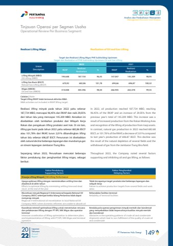 PT Pertamina Hulu Energi 149 2022Laporan TahunanAnnual ReportAnalisis dan Pembahasan ManajemenManagement Discussion and AnalysisOperational Review Per Business SegmentTinjauan Operasi per Segmen UsahaRealisasi Lifting MigasTarget dan Realisasi Lifting Migas PHE Subholding UpstreamTarget dan Realization of PHE Subholding Upstream Oil and Gas LiftingUraianDescription2022 2021RKAP RealisasiRealization % RKAP RealisasiRealization %Lifting Minyak (MBO)Oil Lifting (MBO) 194.648 187.734 96,45 147.047 145.209 98,93Lifting Gas Bumi (BSCF)Natural Gas Lifting (BSCF) 670,92 682,86 101,78 694,66 696,87 100,32Migas (MBOE)Oil and Gas (MBOE) 310.448 305.596 98,44 266.945 265,478 99,55Catatan | Note:Target lifting RKAP tidak termasuk aktivitas M&A.M&A activities not included in RKAP lifting target.In 2022, oil production reached 187.734 MBO, reaching 96.45% of the RKAP and an increase of 29.05% from the previous year's total of 145.209 MBO. This increase was a result of increased production from the Rokan Working Area and recognition of the lifting of production from Iraqi assets. In contrast, natural gas production in 2022 reached 682.68 BSCF, or 101.78 % of the RKAP, a decrease of 2.01% compared to last year's production of 696.87 BSCF. This decline was the result of the natural depletion of several fields and the withdrawal of gas from the Jambaran Tiung Biru field.Throughout 2022, the Company noted several factors supporting and inhibiting oil and gas lifting, as follows:Realisasi lifting minyak pada tahun 2022 yaitu sebesar 187,734 MBO, mencapai 96,45% dari RKAP dan naik 29,05% dari tahun lalu yang mencapai 145.209 MBO. Kenaikan ini disebabkan oleh tambahan produksi dari Wilayah Kerja Rokan dan pengakuan lifting produksi aset Irak. Di sisi lain, lifting gas bumi pada tahun 2022 yaitu sebesar 682,86 BSCF atau 101,78% dari RKAP, turun 2,01% dibandingkan liftingtahun lalu sebesar 696,87 BSCF. Penurunan ini disebabkan oleh natural decline beberapa lapangan dan mundurnya gas on stream lapangan Jambaran Tiung Biru.Sepanjang tahun 2022, Perusahaan mencatat beberapa faktor pendukung dan penghambat lifting migas, sebagai berikut:Faktor PendukungSupporting FactorsFaktor PenghambatDelaying FactorsKinerja Lifting Minyak | Oil Lifting PerformanceUpaya optimasi lifting dengan meminimalkan settling time dan deadstock di akhir tahunEfforts to optimize lifting by minimizing settling time and dead stock at the end of the yearTidak tercapainya target produksi dari beberapa lapangan dan wilayah kerjaFailure to achieve production targets from several fields and work areasMonetisasi minyak Regional 5-Internasional kepada National Oil Company (NOC) setempat ketika kilang Pertamina tidak dapat menyerap minyakRegional 5-International oil monetization to local National Oil Company (NOC) when domestic refineries are unable to absorb oilKehandalan fasilitas terminalReliability of terminal facilitiesKoordinasi intensif optimalisasi lifting untuk menentukan rencana dan pelaksanaan lifting dengan PT KPI, SKK Migas dan operator terminalIntensive coordination of lifting optimization to determine plans and implementation of lifting with PT KPI, SKK Migas and terminal operatorsKendala pola operasi pengiriman minyak mentah dan kondensat yang menyebabkan tidak terpenuhinya kualitas minyak mentah dan kondensatObstacles in the operating patterns of crude oil and condensate shipments which lead to non-fulfillment of the quality of crude oil and condensateRealization of Oil and Gas Lifting