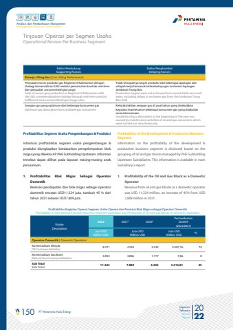 150 PT Pertamina Hulu Energi 2022Laporan TahunanAnnual ReportAnalisis dan Pembahasan ManajemenManagement Discussion and AnalysisOperational Review Per Business SegmentTinjauan Operasi per Segmen UsahaProfitability of the Development & Production Business SegmentInformation on the profitability of the development & production business segment is disclosed based on the grouping of oil and gas blocks managed by PHE Subholding Upstream Subsidiaries. This information is available in each Subsidiary's report.1. Profitability of the Oil and Gas Block as a DomesticOperatorRevenue from oil and gas blocks as a domestic operator was USD 11,324 million, an increase of 45% from USD7,809 million in 2021. Faktor PendukungSupporting FactorsFaktor PenghambatDelaying FactorsKinerja Lifting Gas | Gas Lifting PerformancePenjualan excess produksi gas Regional 3-Kalimantan dengan strategi komersialisasi LNG melalui pemenuhan kontrak mid-term dan penjualan uncommitted/spot cargoSales of excess gas production in Regional 3-Kalimantan with the LNG commercialization strategy through mid-term contract fulfillment and uncommitted/spot cargo salesTidak tercapainya target produksi dari beberapa lapangan dan wilayah kerja termasuk terlambatnya gas onstream lapangan Jambaran Tiung BiruProduction targets were not achieved from several fields and work areas, including delays in onstream gas from the Jambaran Tiung Biru fieldSerapan gas yang optimum dari beberapa konsumen gasOptimum gas absorption from multiple gas consumersKetidakstabilan serapan gas di awal tahun yang disebabkan kegiatan maintenance beberapa konsumen gas yang dilakukan secara bersamaanInstability of gas absorption at the beginning of the year was caused by maintenance activities of several gas consumers which were carried out simultaneouslyProfitabilitas Segmen Usaha Pengembangan & ProduksiInformasi profitabilitas segmen usaha pengembangan & produksi diungkapkan berdasarkan pengelompokan blok migas yang dikelola AP PHE Subholding Upstream. Informasi tersebut dapat dilihat pada laporan masing-masing anak perusahaan. 1. Profitabilitas Blok Migas Sebagai OperatorDomestikRealisasi pendapatan dari blok migas sebagai operatordomestik tercatat USD11.324 juta, tumbuh 45 % daritahun 2021 sebesar USD7.809 juta.Profitabilitas Kegiatan Operasi Segmen Usaha Operasi dan Produksi Blok Migas sebagai Operator DomestikProfitability of Operational Activities Business Segment Operation and Production of Oil and Gas Blocks as Domestic OperatorsUraianDescription2022 2021* 2020*PertumbuhanGrowth(2022:2021)Juta USDMillion USDJuta USDMillion USDJuta USDMillion USD %Operator Domestik | Domestic OperatorsKomersialisasi MinyakOil Commercialization 8.271 4.763 3.535 3.507,76 74Komersialisasi Gas BumiNatural Gas Commercialization 3.053 3.046 1.717 7,06 0Sub TotalSub Total 11.324 7.809 5.252 3.514,81 45