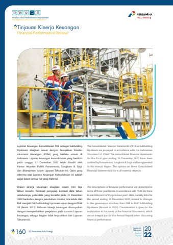 160 PT Pertamina Hulu Energi 2022Laporan TahunanAnnual ReportAnalisis dan Pembahasan ManajemenManagement Discussion and AnalysisFinancial Performance ReviewTinjauan Kinerja KeuanganLaporan Keuangan Konsolidasian PHE sebagai Subholding Upstream disajikan sesuai dengan Pernyataan Standar Akuntansi Keuangan (PSAK) yang berlaku umum di Indonesia. Laporan keuangan konsolidasian yang berakhir pada tanggal 31 Desember 2022 telah diaudit oleh Kantor Akuntan Publik Purwantono, Sungkoro & Surja dan dilampirkan dalam Laporan Tahunan ini. Opini yang diterima atas Laporan Keuangan Konsolidasian ini adalah wajar dalam semua hal yang material.Uraian kinerja keuangan disajikan dalam tren tiga tahun terakhir. Terdapat penyajian kembali data tahun sebelumnya, yaitu data yang berakhir pada 31 Desember 2020 berkaitan dengan perubahan struktur tata kelola dari PHE menjadi PHE Subholding Upstream sesuai dengan PSAK 38 (Revisi 2012). Bahasan kinerja keuangan disampaikan dengan memperhatikan penjelasan pada catatan Laporan Keuangan, sebagai bagian tidak terpisahkan dari Laporan Tahunan ini.The Consolidated Financial Statements of PHE as Subholding Upstream are prepared in accordance with the Indonesian Statement of PSAK. The consolidated financial statements for the fiscal year ending 31 December 2022 have been audited by Purwantono, Sungkoro & Surja and are appended to this Annual Report. The opinion on these Consolidated Financial Statements is fair in all material respects.The descriptions of financial performance are presented in terms of three-year trends. In accordance with PSAK 38, there is a restatement of the previous year's data, namely data for the period ending 31 December 2020, related to changes in the governance structure from PHE to PHE Subholding Upstream (Revised in 2012). Consideration is given to the explanation in the notes to the Financial Statements, which are an integral part of this Annual Report, when discussing financial performance.