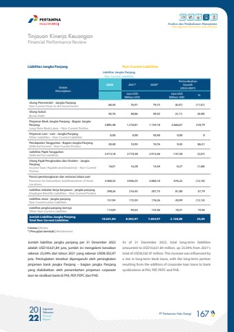 PT Pertamina Hulu Energi 167 2022Laporan TahunanAnnual ReportAnalisis dan Pembahasan ManajemenManagement Discussion and AnalysisFinancial Performance ReviewTinjauan Kinerja KeuanganAs of 31 December 2022, total long-term liabilities amounted to USD10,631.84 million, up 25.04% from 2021's total of USD8,502.97 million. This increase was influenced by a rise in long-term bank loans, with the long-term portion resulting from the addition of corporate loan loans to bank syndications at PHI, PEP, PEPC and PHE.Non-Current LiabilitiesJumlah liabilitas jangka panjang per 31 Desember 2022 adalah USD10.631,84 juta, jumlah ini mengalami kenaikan sebesar 25,04% dari tahun 2021 yang sebesar USD8.502,97 juta. Peningkatan tersebut dipengaruhi oleh peningkatan pinjaman bank jangka Panjang %u2013 bagian jangka Panjang yang diakibatkan oleh penambahan pinjaman corporate loan ke sindikasi bank di PHI, PEP, PEPC dan PHE.Liabilitas Jangka PanjangLiabilitas Jangka PanjangNon Current LiabilitiesUraianDescription2022 2021* 2020*PertumbuhanGrowth(2022:2021)Juta USDMillion USDJuta USDMillion USD %Utang Pemerintah - Jangka PanjangNon-Current Dues to the Government 68,44 76,91 79,75 (8,47) (11,01)Utang SukukBonds Debt 44,76 48,86 49,42 (4,11) (8,40)Pinjaman Bank Jangka Panjang - Bagian Jangka PanjangLong-Term Bank Loans %u2013 Non-Current Portion3.885,48 1.218,81 1.159,18 2.666,67 218,79Pinjaman Lain - Lain - Jangka PanjangOther Liabilities %u2013 Non-Current Liabilities 0,00 0,00 50,40 0,00 0Pendapatan Tangguhan - Bagian Jangka PanjangDeferred Income %u2013 Non-Current Portion 20,40 10,95 10,76 9,45 86,31Liabilitas Pajak TangguhanDeferred Tax Liabilities 2.573,18 2.710,58 2.913,46 -137,40 (5,07)Utang Pajak Penghasilan dan Dividen - Jangka PanjangIncome Taxes Payable and Dividends %u2013 Non-Current Portion16,01 16,28 14,44 -0,27 (1,68)Provisi pembongkaran dan restorasi lokasi asetProvision for Demolition and Restoration of Asset Locations3.460,33 3.936,55 2.860,10 -476,22 (12,10)Liabilitas imbalan kerja karyawan - jangka panjangEmployee Benefits Liabilities %u2013 Non-Current Portion 298,26 216,45 207,75 81,80 37,79Liabilitas sewa - jangka panjangNon-Current Lease Liabilities 151,94 172,93 176,26 -20,99 (12,14)Liabilitas jangka panjang lainnya Other Non-Current Liabilities 113,04 94,63 133,46 18,41 19,46Jumlah Liabilitas Jangka PanjangTotal Non-Current Liabilities 10.631,84 8.502,97 7.654,97 2.128,88 25,04Catatan | Notes:*) Penyajian kembali | Restatement
