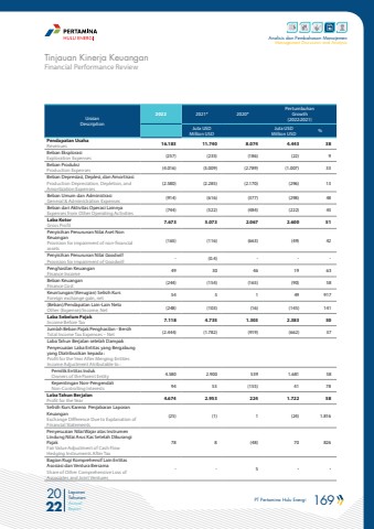 PT Pertamina Hulu Energi 169 2022Laporan TahunanAnnual ReportAnalisis dan Pembahasan ManajemenManagement Discussion and AnalysisFinancial Performance ReviewTinjauan Kinerja KeuanganUraianDescription2022 2021* 2020*PertumbuhanGrowth(2022:2021)Juta USDMillion USDJuta USDMillion USD %Pendapatan UsahaRevenues 16.183 11.740 8.074 4.443 38Beban EksplorasiExploration Expenses (257) (235) (186) (22) 9Beban ProduksiProduction Expenses (4.016) (3.009) (2.789) (1.007) 33Beban Depresiasi, Deplesi, dan AmortisasiProduction Depreciation, Depletion, and Amortization Expenses (2.580) (2.285) (2.170) (296) 13Beban Umum dan AdministrasiGeneral & Administration Expenses (914) (616) (377) (298) 48Beban dari Aktivitas Operasi LainnyaExpenses from Other Operating Activities (744) (522) (484) (222) 43Laba KotorGross Profit 7.673 5.073 2.067 2.600 51Penyisihan Penurunan Nilai Aset Non KeuanganProvision for impairment of non-financial assets(165) (116) (663) (49) 42Penyisihan Penurunan Nilai GoodwillProvision for impairment of Goodwill - (0.4) - - -Penghasilan KeuanganFinance Income 49 30 46 19 63Beban KeuanganFinance Cost (244) (154) (165) (90) 58Keuntungan/(Kerugian) Selisih KursForeign exchange gain, net 54 5 1 49 917(Beban)/Pendapatan Lain-Lain NetoOther (Expense)/Income, Net (248) (103) (16) (145) 141Laba Sebelum Pajak Income Before Tax 7.118 4.735 1.303 2.383 50Jumlah Beban Pajak Penghasilan - BersihTotal Income Tax Expenses %u2013 Net (2.444) (1.782) (919) (662) 37Laba Tahun Berjalan setelah Dampak Penyesuaian Laba Entitas yang Bergabung yang Diatribusikan kepada :Profit for the Year After Merging Entities Income Adjustment Atributable to :Pemilik Entitas IndukOwners of the Parent Entity 4.580 2.900 539 1.681 58Kepentingan Non-PengendaliNon-Controlling Interests 94 53 (155) 41 78Laba Tahun BerjalanProfit for the Year 4.674 2.953 224 1.722 58Selisih Kurs Karena Penjabaran Laporan KeuanganExchange Difference Due to Explanation of Financial Statements(25) (1) 1 (24) 1.816Penyesuaian Nilai Wajar atas Instrumen Lindung Nilai Arus Kas Setelah Dikurangi PajakFair Value Adjustment of Cash Flow Hedging Instruments After Tax78 8 (48) 70 826Bagian Rugi Komprehensif Lain Entitas Asosiasi dan Ventura BersamaShare of Other Comprehensive Loss of Associates and Joint Ventures- - 5 - -