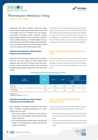 180 PT Pertamina Hulu Energi 2022Laporan TahunanAnnual ReportAnalisis dan Pembahasan ManajemenManagement Discussion and AnalysisAbility to Pay DebtsKemampuan Membayar UtangKemampuan PHE dalam membayar utang baik jangka pendek maupun jangka panjang dapat dilihat melalui nilai rasio likuiditas dan rasio solvabilitas. Nilai rasio likuiditas menunjukkan kemampuan dalam memenuhi liabilitas jangka pendek yang diukur melalui rasio kas dan rasio lancar. Rasio kas dihitung dengan cara membandingkan kas yang dimiliki dengan jumlah liabilitas jangka pendek, sedangkan rasio lancar dihitung dengan cara membandingkan jumlah aset lancar dengan jumlah liabilitas jangka pendek.KEMAMPUAN MEMBAYAR UTANG JANGKA PENDEK (RASIO LIKUIDITAS)Pada tahun 2022, Perusahaan mencatat rasio kas sebesar 0,79% dan rasio lancar sebesar 2%. Rasio tersebut lebih tinggi dari rasio tahun 2021. Dari rasio kas dan rasio lancar, tercermin bahwa Perusahaan mampu untuk memenuhi kewajiban jangka pendek menggunakan aset lancar yang dimiliki.Kemampuan Membayar Utang Jangka Pendek (Rasio Likuiditas)Ability to Pay Current Payables (Liquidity Ratio)UraianDescription 2022 2021* 2020*PertumbuhanGrowth(2022:2021)JumlahTotal %Rasio KasCash Ratio 0,78 0,49 0,46 0,29 59Rasio LancarCurrent Ratio 2,00 1,27 1,66 0,73 57Catatan | Notes:*) Penyajian kembali | RestatementThe liquidity ratio and solvency ratio values indicate PHE's ability to pay short- and long-term debts. The liquidity ratio value demonstrates the ability to meet short-term liabilities as measured by the cash and current ratios. The cash ratio is calculated by comparing total short-term liabilities to total cash held, whereas the current ratio is calculated by comparing total current assets to total short-term liabilities.ABILITY TO PAY CURRENT PAYABLES (LIQUIDITY RATIO)In 2022, the Company's cash ratio was 0.79% and its current ratio was 2%. This ratio exceeded the ratio from 2021. According to the cash ratio and current ratio, the Company was able to meet its short-term liabilities with its current assets.ABILITY TO PAY NON-CURRENT PAYABLES (SOLVENCY RATIO)The solvency ratio shows the Company's ability to pay its obligations and is measured through four ratios, namely:1. The ratio of interest-bearing debt to assets is calculated by comparing the total interest-bearing debt with total assets. 2. The ratio of interest-bearing debt to equity is calculated by comparing the total interest-bearing debt with total equity. KEMAMPUAN MEMBAYAR UTANG JANGKA PANJANG (RASIO SOLVABILITAS)Rasio solvabilitas menunjukkan kemampuan Perusahaan dalam membayar kewajiban-kewajibannya dan diukur melalui empat rasio, yaitu:1. Rasio utang berbunga terhadap aset yang dihitungdengan cara membandingkan jumlah utang berbungadengan jumlah aset.2. Rasio utang berbunga terhadap ekuitas yang dihitungdengan cara membandingkan jumlah utang berbungadengan jumlah ekuitas.