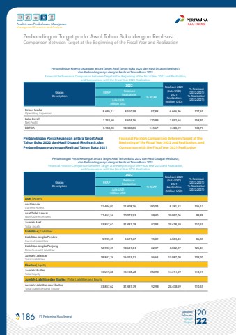 186 PT Pertamina Hulu Energi 2022Laporan TahunanAnnual ReportAnalisis dan Pembahasan ManajemenManagement Discussion and AnalysisComparison Between Target at the Beginning of the Fiscal Year and RealizationPerbandingan Target pada Awal Tahun Buku dengan RealisasiFinancial Position Comparison Between Target at the Beginning of the Fiscal Year 2022 and Realization, and Comparison with the Fiscal Year 2021 RealizationPerbandingan Posisi Keuangan antara Target Awal Tahun Buku 2022 dan Hasil Dicapai (Realisasi), dan Perbandingannya dengan Realisasi Tahun Buku 2021Perbandingan Posisi Keuangan antara Target Awal Tahun Buku 2022 dan Hasil Dicapai (Realisasi),dan Perbandingannya dengan Realisasi Tahun Buku 2021Financial Position Comparison between Target at the Beginning of the Fiscal Year 2022 and Realization,and Comparison with the Fiscal Year 2021 RealizationUraianDescription2022 Realisasi 2021(Juta USD)2021 Realization(Million USD)% Realisasi (2022:2021)% Realization (2022:2021)RKAP RealisasiRealization% RKAPJuta USDMillion USDAset | AssetsAset LancarCurrent Assets 11.404,07 11.408,26 100,04 8.381,53 136,11Aset Tidak LancarNon-Current Assets 22.453,54 20.073,53 89,40 20.097,06 99,88Jumlah AsetTotal Assets 33.857,62 31.481,79 92,98 28.478,59 110,55Liabilitas | LiabilitiesLiabilitas Jangka PendekCurrent Liabilities 5.935,35 5.691,67 95,89 6.584,03 86,45Liabilitas Jangka PanjangNon-Current Liabilities 12.907,39 10.631,84 82,37 8.502,97 125,04Jumlah LiabilitasTotal Liabilities 18.842,74 16.323,51 86,63 15.087,00 108,20Ekuitas | EquityJumlah EkuitasTotal Equity 15.014,88 15.158,28 100,96 13.391,59 113,19Jumlah Liabilitas dan Ekuitas | Total Liabilities and EquityJumlah Liabilitas dan EkuitasTotal Liabilities and Equity 33.857,62 31.481,79 92,98 28.478,59 110,55Perbandingan Kinerja Keuangan antara Target Awal Tahun Buku 2022 dan Hasil Dicapai (Realisasi), dan Perbandingannya dengan Realisasi Tahun Buku 2021Financial Performance Comparison between Target at the Beginning of the Fiscal Year 2022 and Realization,and Comparison with the Fiscal Year 2021 RealizationUraianDescription2022 Realisasi 2021(Juta USD)2021 Realization(Million USD)% Realisasi (2022:2021)% Realization (2022:2021)RKAP RealisasiRealization% RKAPJuta USDMillion USDBeban UsahaOperating Expenses 8.695,11 8.510,59 97,88 6.666,96 127,65Laba BersihNet Profit 2.733,60 4.674,16 170,99 2.952,64 158,30EBITDA 7.158,98 10.428,83 145,67 7.408,19 140,77