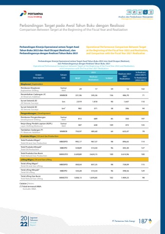 PT Pertamina Hulu Energi 187 2022Laporan TahunanAnnual ReportAnalisis dan Pembahasan ManajemenManagement Discussion and AnalysisComparison Between Target at the Beginning of the Fiscal Year and RealizationPerbandingan Target pada Awal Tahun Buku dengan RealisasiOperational Performance Comparison Between Target at the Beginning of the Fiscal Year 2022 and Realization, and Comparison with the Fiscal Year 2021 RealizationPerbandingan Kinerja Operasional antara Target Awal Tahun Buku 2022 dan Hasil Dicapai (Realisasi), dan Perbandingannya dengan Realisasi Tahun Buku 2021Perbandingan Kinerja Operasional antara Target Awal Tahun Buku 2022 dan Hasil Dicapai (Realisasi), dan Perbandingannya dengan Realisasi Tahun Buku 2021Operational Performance Comparison between Target at the Beginning of the Fiscal Year 2022 and Realization,and Comparison with the Fiscal Year 2021 RealizationUraianDescriptionSatuanUnit2022 Realisasi 20212021 Realization% Realisasi (2022:2021)% Realization (2022:2021)RKAP RealisasiRealization % RKAPEksplorasi | ExplorationPemboran EksplorasiExploration DrillingSumurWell 29 17 59 12 142Penambahan Cadangan 2C2C Reserves Addition MMBOE 221,96 345,36 156 486,70 71Survei Seismik 2D2D Seismic Surveys km 2.019 1.818 90 1.647 110Survei Seismik 3D3D Seismic Surveys km2 982 371 38 396 94Pengembangan | Development Pemboran PengembanganDevelopment DrillingSumurWell 813 689 85 350 197Kerja Ulang Pindah Lapisan (KUPL)Layer-Shifting WorkoverSumurWell 587 638 109 472 135Tambahan Cadangan P1P1 Reserves Addition MMBOE 754,97 485,60 64 623,47 78Produksi Migas | Oil and Gas ProductionTotal Produksi Migas*Total Oil and Gas Production MBOEPD 992,17 967,37 98 896,65 114Total Produksi Minyak*Total Oil Production MBOPD 538,09 514,44 96 445,30 127Total Produksi Gas BumiTotal Natural Gas Production MMSCFD 2.630,80 2.624,15 100 2.614,96 100Lifting Migas | Oil and Gas LiftingTotal Lifting Migas*Total Oil and Gas Lifting MBOEPD 850,54 837,25 98 728,09 115Total Lifting Minyak*Total Oil Lifting MBOPD 533,28 514,34 96 398,56 129Total Lifting Gas BumiTotal Natural Gas Lifting MMSCFD 1.838,13 1,870,85 102 1.909,23 98Catatan | Notes:(*) Tidak termasuk M&A. Excludes M&A.