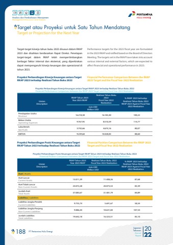 188 PT Pertamina Hulu Energi 2022Laporan TahunanAnnual ReportAnalisis dan Pembahasan ManajemenManagement Discussion and AnalysisTarget-target kinerja tahun buku 2023 disusun dalam RKAP 2023 dan disahkan berdasarkan Rapat Direksi. Penetapan target-target dalam RKAP telah mempertimbangkan berbagai faktor internal dan eksternal, yang diperkirakan dapat mempengaruhi kinerja keuangan dan operasional di tahun 2023.Proyeksi Perbandingan Kinerja Keuangan antara Target RKAP 2023 terhadap Realisasi Tahun Buku 2022Proyeksi Perbandingan Kinerja Keuangan antara Target RKAP 2023 terhadap Realisasi Tahun Buku 2022Financial Performance Comparison between the RKAP 2023 Target and the Fiscal Year 2022 RealizationUraianDescriptionRKAP Tahun 2023Year 2023 RKAPRealisasi Tahun Buku 2022Fiscal Year 2022 Realization% RKAP 2023 terhadapRealisasi Tahun Buku 2022RKAP 2023 Against Fiscal Year2022 Realization Juta USDMillion USDPendapatan UsahaRevenue 16.218,38 16.183,40 100,22Beban UsahaOperating Expenses 9.767,95 8.510,59 114,77Laba BersihNet Profit 3.742,66 4.674,16 80,07EBITDA 9.239,60 10.428,83 88,60Target atau Proyeksi untuk Satu Tahun MendatangTarget or Projection for the Next YearPerformance targets for the 2023 fiscal year are formulated in the 2023 RKAP and ratified based on the Board of Directors Meeting. The targets set in the RKAP have taken into account various internal and external factors, which are expected to affect financial and operational performance in 2023.Financial Performance Comparison Between the RKAP 2023 Target and the Fiscal Year 2022 Realization Financial Position Comparison Between the RKAP 2023 Target and Fiscal Year 2022 RealizationProyeksi Perbandingan Posisi Keuangan antara Target RKAP Tahun 2023 terhadap Realisasi Tahun Buku 2022Proyeksi Perbandingan Posisi Keuangan antara Target RKAP Tahun 2023 terhadap Realisasi Tahun Buku 2022Financial Position Comparison between the RKAP 2023 Target and Fiscal Year 2022 RealizationUraianDescriptionRKAP Tahun 2023Year 2023 RKAPRealisasi Tahun Buku 2022Fiscal Year 2022 Realization % RKAP 2023 terhadapRealisasi Tahun Buku 2022RKAP 2023 Against Fiscal Year2022 RealizationJuta USDMillion USDAset | AssetsAset LancarCurrent Assets 13.011,39 11.408,26 87,68Aset Tidak LancarNon-Current Assets 24.072,28 20.073,53 83,39Jumlah AsetTotal Assets 37.083,67 31.481,79 84,89Liabilitas | LiabilitiesLiabilitas Jangka PendekCurrent Liabilities 9.755,74 5.691,67 58,34Liabilitas Jangka PanjangNon-Current Liabilities 9.886,44 10.631,84 107,54Jumlah LiabilitasTotal Liabilities 19.642,18 16.323,51 83,10