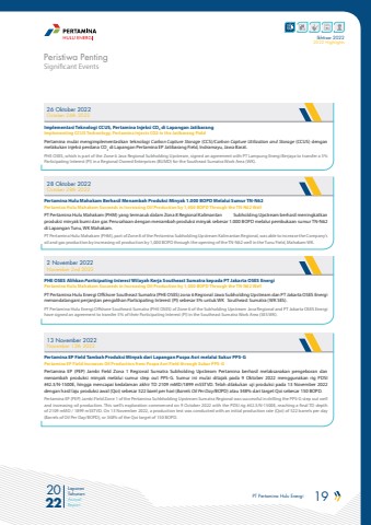PT Pertamina Hulu Energi 19 2022Laporan TahunanAnnual ReportIkhtisar 20222022 Highlights28 Oktober 2022October 28th 20222 November 2022November 2nd 202226 Oktober 2022October 26th 2022Pertamina Hulu Mahakam Berhasil Menambah Produksi Minyak 1.000 BOPD Melalui Sumur TN-N62Pertamina Hulu Mahakam Succeeds in Increasing Oil Production by 1,000 BOPD Through the TN-N62 WellPT Pertamina Hulu Mahakam (PHM) yang termasuk dalam Zona 8 Regional Kalimantan Subholding Upstream berhasil meningkatkan produksi minyak bumi dan gas Perusahaan dengan menambah produksi minyak sebesar 1.000 BOPD melalui pembukaan sumur TN-N62 di Lapangan Tunu, WK Mahakam. PT Pertamina Hulu Mahakam (PHM), part of Zone 8 of the Pertamina Subholding Upstream Kalimantan Regional, was able to increase the Company%u2019s oil and gas production by increasing oil production by 1,000 BOPD through the opening of the TN-N62 well in the Tunu Field, Mahakam WK.PHE OSES Alihkan Participating Interest Wilayah Kerja Southeast Sumatra kepada PT Jakarta OSES EnergiPertamina Hulu Mahakam Succeeds in Increasing Oil Production by 1,000 BOPD Through the TN-N62 WellPT Pertamina Hulu Energi Offshore Southeast Sumatra (PHE OSES) zona 6 Regional Jawa Subholding Upstream dan PT Jakarta OSES Energi menandatangani perjanjian pengalihan Participating Interest (PI) sebesar 5% untuk WK Southeast Sumatra (WK SES). PT Pertamina Hulu Energi Offshore Southeast Sumatra (PHE OSES) of Zone 6 of the Subholding Upstream Java Regional and PT Jakarta OSES Energi have signed an agreement to transfer 5% of their Participating Interest (PI) in the Southeast Sumatra Work Area (SES WK).Implementasi Teknologi CCUS, Pertamina Injeksi CO2 di Lapangan JatibarangImplementing CCUS Technology, Pertamina Injects CO2 in the Jatibarang FieldPertamina mulai mengimplementasikan teknologi Carbon Capture Storage (CCS)/Carbon Capture Utilization and Storage (CCUS) dengan melakukan injeksi perdana CO2 di Lapangan Pertamina EP Jatibarang Field, Indramayu, Jawa Barat. PHE OSES, which is part of the Zone 6 Java Regional Subholding Upstream, signed an agreement with PT Lampung Energi Berjaya to transfer a 5% Participating Interest (PI) in a Regional Owned Enterprises (BUMD) for the Southeast Sumatra Work Area (WK).Significant EventsPeristiwa Penting13 November 2022November 13th 2022Pertamina EP Field Tambah Produksi Minyak dari Lapangan Puspa Asri melalui Sukur PPS-GPertamina EP Field Increases Oil Production from Puspa Asri Field through Sukur PPS-GPertamina EP (PEP) Jambi Field Zona 1 Regional Sumatra Subholding Upstream Pertamina berhasil melaksanakan pengeboran dan menambah produksi minyak melalui sumur step out PPS-G. Sumur ini mulai ditajak pada 9 Oktober 2022 menggunakan rig PDSI #42.3/N-1500E, hingga mencapai kedalaman akhir TD 2109 mMD/1899 mSSTVD. Telah dilakukan uji produksi pada 13 November 2022 dengan hasil laju produksi awal (Qoi) sebesar 522 barel per hari (Barrels Oil Per Day/BOPD) atau 348% dari target Qoi sebesar 150 BOPD. Pertamina EP (PEP) Jambi Field Zone 1 of the Pertamina Suhbholding Upstream Sumatra Regional was successful in drilling the PPS-G step out well and increasing oil production. This well%u2019s exploration commenced on 9 October 2022 with the PDSI rig #42.3/N-1500E, reaching a final TD depth of 2109 mMD / 1899 mSSTVD. On 13 November 2022, a production test was conducted with an initial production rate (Qoi) of 522 barrels per day (Barrels of Oil Per Day/BOPD), or 348% of the Qoi target of 150 BOPD.