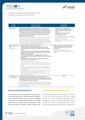192 PT Pertamina Hulu Energi 2022Laporan TahunanAnnual ReportAnalisis dan Pembahasan ManajemenManagement Discussion and AnalysisMarketing and Market Share AspectsAspek Pemasaran dan Pangsa PasarMAINTAINING CUSTOMER SATISFACTIONPHE Subholding Upstream maintains customer satisfaction by ensuring service performance and product quality. At least once a year, a customer satisfaction survey is conducted periodically. Product quantity (conformity of product sales volume and supply guarantees), product quality (conformity of product specifications and measuring MENJAGA KEPUASAN PELANGGANPHE Subholding Upstream memastikan kinerja pelayanan dan kualitas produk untuk menjaga kepuasan pelanggan. Secara berkala, dilakukan survei kepuasan pelanggan minimal satu kali dalam setahun. Parameter yang dinilai dalam survei yaitu product quantity (kesesuaian volume penjualan produk dan jaminan pasokan), product qualityProdukProductStrategi PemasaranMarketing StrategyPangsa PasarMarket ShareLNG dan LPGLNG and LPGPerencanaan produksi dan pemasaran LNG, LPG, dan kondensat dilakukan melalui wadah Joint Management Group (JMG). JMG terdiri dari PT Pertamina (Persero), Pertamina Hulu Mahakam (PHM), Pertamina Hulu Sanga Sanga (PHSS), Pertamina Hulu Kalimantan Timur (PHKT), Chevron Indonesia, dan ENI Muara Bakau. Dalam halstrategi dan implementasi pemasaran, PT Badak NGL berperan sebagai pendukung bagi JMG.The Joint Management Group (JMG) container is used to plan and market LNG, LPG, and condensate production, consisting of PT Pertamina (Persero), Pertamina Hulu Mahakam (PHM), Pertamina Hulu Sanga-Sanga (PHSS), Pertamina Hulu East Kalimantan (PHKT), Chevron Indonesia, and ENI Muara Bakau. PT Badak NGL assists the JMG with marketing strategy and implementation.%u2022 Pelanggan LNG, di antaranya PT Nusantara Regas, TotalEnergies Gas Power Asia Pte Ltd, Shell, Kyushu Electric.%u2022 Pelanggan LPG, di antaranya PT Pertamina Patra Niaga%u2022 LNG customers, including PT Nusantara Regas, TotalEnergies Gas Power Asia Pte Ltd, Shell, Kyushu Electric.%u2022 LPG customers, including PT Pertamina Patra NiagaLayanan KomersialLNGLNG Commercial Service%u2022 Memberdayakan jaringan bisnis yang ada.%u2022 Partisipasi aktif dalam berbagai event migas nasional dan internasional, serta berkoordinasi dengan Pertamina Business Forum.%u2022 Kerja sama pemasaran dengan mitra strategis yang memiliki jaringan operasional maupun keanggotaan luas, di antaranya Indonesia Gas Society (IGS).%u2022 Pemasaran aktif kepada calon pengguna jasa, terutama perusahaan-perusahaan yang sedang dalam masa pembangunan kilang LNG.%u2022 Mengembangkan kanal pemasaran berbasis daring melalui website khusus dan sosial media.%u2022 Empower existing business networks%u2022 Active participation in various national and international oil and gas events, as well as coordinating with the Pertamina Business Forum;%u2022 Marketing cooperation with strategic partners with extensive operational and membership networks, including the Indonesia Gas Society (IGS);%u2022 Active marketing to potential service users, especially companies currently in the construction phase of LNG plants;%u2022 Developing online-based marketing channels through special websites and social media.Pelayanan komersialisasi LNG diarahkan untuk menjangkau pasar nasional dan internasional.LNG commercialization services are directed to reach national and international markets.Jasa PengeboranDrilling ServicesTetap bertumpu pada penggunaan aset lama dan baru serta pemasaran dengan teknik cross-selling dan bundling dalam sebuah management project untuk memperkuat citra PDSI sebagai One-Stop Services Company di bidang hulu migas.Continuing to rely on existing and new assets, as well as marketing with cross-selling and bundling techniques in a project management that strengthens PDSI's image as an upstream oil and gas One-Stop Services CompanyNA