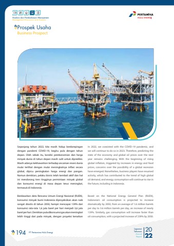 194 PT Pertamina Hulu Energi 2022Laporan TahunanAnnual ReportAnalisis dan Pembahasan ManajemenManagement Discussion and AnalysisProspek UsahaBusiness ProspectSepanjang tahun 2022, kita masih hidup berdampingan dengan pandemi COVID-19, begitu pula dengan tahun depan. Oleh sebab itu, kondisi perekonomian dan harga minyak dunia di tahun depan masih sulit untuk diprediksi. Masih adanya kekhawatiran terhadap ancaman resesi dunia mulai terlihat dengan mulai meningkatnya inflasi secara global, dipicu peningkatan harga energi dan pangan. Namun demikian, pelaku bisnis telah kembali aktif dan hal ini mendorong tren tingginya permintaan minyak global dan konsumsi energi di masa depan terus meningkat, termasuk di Indonesia.Berdasarkan data Rencana Umum Energi Nasional (RUEN), konsumsi minyak bumi Indonesia diproyeksikan akan naik sangat drastis di tahun 2050, hampir mencapai 139% dari konsumsi rata-rata 1,6 juta barel per hari menjadi 3,6 juta barel per hari. Demikian pula dikonsumsi gas akan meningkat lebih tinggi dari pada minyak, dengan proyeksi kenaikan In 2022, we coexisted with the COVID-19 pandemic, and we will continue to do so in 2023. Therefore, predicting the state of the economy and global oil prices over the next year remains challenging. With the beginning of rising global inflation, triggered by increases in energy and food prices, concerns over the possibility of a global recession have emerged. Nonetheless, business players have resumed activity, which has contributed to the trend of high global oil demand, and energy consumption will continue to rise in the future, including in Indonesia.Based on the National Energy General Plan (RUEN), Indonesia's oil consumption is projected to increase dramatically by 2050, from an average of 1.6 million barrels per day to 3.6 million barrels per day, an increase of nearly 139%. Similarly, gas consumption will increase faster than oil consumption, with a projected increase of 239% by 2050.