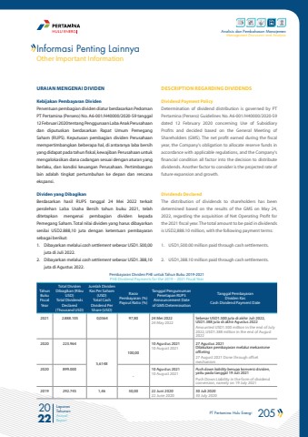 PT Pertamina Hulu Energi 205 2022Laporan TahunanAnnual ReportAnalisis dan Pembahasan ManajemenManagement Discussion and AnalysisURAIAN MENGENAI DIVIDENKebijakan Pembayaran DividenPenentuan pembagian dividen diatur berdasarkan Pedoman PT Pertamina (Persero) No. A6-001/H40000/2020-S9 tanggal 12 Februari 2020 tentang Penggunaan Laba Anak Perusahaan dan diputuskan berdasarkan Rapat Umum Pemegang Saham (RUPS). Keputusan pembagian dividen Perusahaan mempertimbangkan beberapa hal, di antaranya laba bersih yang didapat pada tahun fiskal, kewajiban Perusahaan untuk mengalokasikan dana cadangan sesuai dengan aturan yang berlaku, dan kondisi keuangan Perusahaan. Pertimbangan lain adalah tingkat pertumbuhan ke depan dan rencana ekspansi.Dividen yang DibagikanBerdasarkan hasil RUPS tanggal 24 Mei 2022 terkait perolehan Laba Usaha Bersih tahun buku 2021, telah ditetapkan mengenai pembagian dividen kepada Pemegang Saham. Total nilai dividen yang harus dibayarkan senilai USD2.888,10 juta dengan ketentuan pembayaran sebagai berikut:1. Dibayarkan melalui cash settlement sebesar USD1.500,00 juta di Juli 2022.2. Dibayarkan melalui cash settlement sebesar USD1.388,10 juta di Agustus 2022.Pembayaran Dividen PHE untuk Tahun Buku 2019-2021PHE Dividend Payments for the 2019 %u2013 2021 Fiscal YearTahunBukuFiscal YearTotal DividenDibagikan (Ribu USD)Total Dividends Declared (Thousand USD)Jumlah DividenKas Per Saham (USD)Total Cash Dividend Per Share (USD)RasioPembayaran (%)Payout Ratio (%)Tanggal PengumumanPenetapan RUPSAnnouncement Date of GMS DeterminationTanggal PembayaranDividen KasCash Dividend Payment Date2021 2.888.105 0,0364 97,80 24 Mei 202224 May 2022Sebesar USD1.500 juta di akhir Juli 2022, USD1.388 juta di akhir Agustus 2022Amounted USD1.500 million in the end of July 2022, USD1.388 million in the end of August 20222020 223.9645,6148100,0010 Agustus 202110 August 202127 Agustus 2021Dilakukan pembayaran melalui mekanisme offseting27 August 2021 Done through offset mechanism2020 899.000-10 Agustus 202110 August 2021Push down liability berupa konversi dividen, yaitu pada tanggal 19 Juli 2021Push Down Liability in the form of dividend conversion, namely on 19 July 20212019 292.745 1,46 50,00 22 Juni 202022 June 202030 Juli 202030 July 2020Informasi Penting LainnyaOther Important InformationDESCRIPTION REGARDING DIVIDENDSDividend Payment PolicyDetermination of dividend distribution is governed by PT Pertamina (Persero) Guidelines No. A6-001/H40000/2020-S9 dated 12 February 2020 concerning Use of Subsidiary Profits and decided based on the General Meeting of Shareholders (GMS). The net profit earned during the fiscal year, the Company's obligation to allocate reserve funds in accordance with applicable regulations, and the Company's financial condition all factor into the decision to distribute dividends. Another factor to consider is the projected rate of future expansion and growth.Dividends DeclaredThe distribution of dividends to shareholders has been determined based on the results of the GMS on May 24, 2022, regarding the acquisition of Net Operating Profit for the 2021 fiscal year. The total amount to be paid in dividends is USD2,888.10 million, with the following payment terms:1. USD1,500.00 million paid through cash settlements.2. USD1,388.10 million paid through cash settlements.