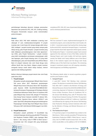 PT Pertamina Hulu Energi 207 2022Laporan TahunanAnnual ReportAnalisis dan Pembahasan ManajemenManagement Discussion and AnalysisInformasi Penting LainnyaInformasi Penting Lainnyacompliance (PSC, JOA, JOC, Laws, Government Assignments), and to minimize potential losses.AcquisitionsPHE has screened 57 assets, implemented/managed for 19 investment projects, and conducted three Joint Studies (JS) in 2022. 1 investment project had reached the closing stage by the end of 2022, namely the Sempati Project; 1 investment project had the Asset Sales Agreement (ASA) signed, namely the Tambourine Project; 1 investment project had received approval for the extension of one of the fields, namely the Saluang Project; and 2 joint studies (JS) had been signed, namely the Melati Joint Study (offshore area of the Manui Basin in the Sulawesi region) and the Bunga Joint Study (offshore area of the North East Java Basin). The remaining inorganic investment projects are still ongoing evaluation, internal approval, and bidding negotiations.The following details relate to several acquisition projects and the Joint Studies in 2022:1. Sempati ProjectA post-2027 Senoro Toili Working Area extension project. The decision to extend the Senoro Toili Working Area after 2027 is stated in the Minister of Energy and Mineral Resources Decree No.229.K/HK.02/MEM.M/2021 concerning Approval of Extension & Determination of Forms & Main Provisions (Terms & Conditions) PSC in the Senoro-Toili Working Area, with PT Pertamina Hulu Energi Tomori Sulawesi having a PI of 50%. The payment of a Signature Bonus of USD 26.71 million on 1 April 2022 was followed by the signing of the Senoro Toili Working Area Production Sharing Contract Extension after 2027 by the Minister of Energy and Mineral Resources on 2 June 2022.2. The Tambourine ProjectA PI purchase project in ExxonMobil Iraq Limited in the West Qurna-1 field, currently owned by PT Pertamina Iraq Exploration Production (PIREP). If West Qurna-1 were to close, the PI of PIREP would increase from 10% to 20%, which would affect on the addition of 2P of 59 MMBOE. pertimbangan teknologi, ekonomi, strategis, pemenuhan kepatuhan atas peraturan (PSC, JOA, JOC, Undang-Undang, Penugasan Pemerintah) maupun untuk meminimalkan potensi kerugian.AkuisisiPada tahun 2022, PHE telah melakukan screening asset sebanyak 57 aset, melaksanakan/mengelola 19 proyek investasi, dan 3 Joint Study (JS). Sampai dengan akhir tahun 2022, terdapat 1 proyek investasi yang selesai sampai pada tahap closing, yaitu Proyek Sempati; 1 proyek investasi yang telah dilakukan penandatanganan Asset Sales Agreementnya (ASA), yaitu Proyek Tambourine; 1 proyek investasi yang telah mendapatkan persetujuan perpanjangan salah satu lapangan, yaitu Proyek Saluang; serta 2 JS yang telah ditandatangani, yaitu Joint Study Melati (area offshore Manui Basin di wilayah Sulawesi) dan Joint Study Bunga (area offshore North East Java Basin). Adapun proyek investasi anorganik lainnya masih dalam tahap evaluasi, internal approval, dan bidding negotiation. Berikut informasi beberapa proyek akuisisi dan Joint Studypada tahun 2022:1. Proyek SempatiMerupakan proyek perpanjangan Wilayah Kerja Senoro Toili pasca tahun 2027. Keputusan perpanjangan Wilayah Kerja Senoro Toili pasca tahun 2027 dinyatakan pada Kepmen ESDM No.229.K/HK.02/MEM.M/2021 tentang Persetujuan Perpanjangan & Penetapan Bentuk & Ketentuan-Ketentuan Pokok (Terms & Conditions) KKS pada Wilayah Kerja Senoro-Toili, dengan PT Pertamina Hulu Energi Tomori Sulawesi memiliki PI sebesar 50%. Pembayaran Signature Bonus sebesar USD26,71 juta pada 1 April 2022, dilanjutkan dengan penandatanganan Perpanjangan Kontrak Bagi Hasil Wilayah Kerja Senoro Toili pasca 2027 oleh Menteri ESDM tanggal 2 Juni 2022.2. Proyek TambourineMerupakan proyek pembelian PI ExxonMobil Iraq Limited di lapangan eksisting yang dimiliki PT Pertamina Irak Eksplorasi Produksi (PIREP), yaitu lapangan West Qurna-1. Jika closing, maka PI PIREP di West Qurna-1 bertambah dari 10% menjadi 20% yang berdampak