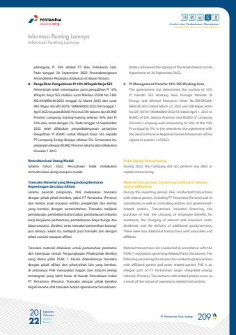 PT Pertamina Hulu Energi 209 2022Laporan TahunanAnnual ReportAnalisis dan Pembahasan ManajemenManagement Discussion and AnalysisInformasi Penting LainnyaInformasi Penting LainnyaNotary witnessed the signing of the Amendments to the Agreement on 20 September 2022.8. PI Management Transfer 10% SES Working AreaThe government has determined the portion of 10%PI transfer SES Working Area through Minister ofEnergy and Mineral Resources letter No.T89/MG.04/MEM.M/2022 dated March 22, 2022 and SKK Migas letter No.SRT-0070/ SKKMI0000/2022/S9 dated April 1, 2022 to BUMD of DKI Jakarta Province and BUMD of LampungProvince Lampung each amounting to 50% of the 10%PI or equal to 5%. In the meantime, the agreement withthe Jakarta Province Regional Owned Enterprises will be signed in quarter 1 of 2023.Debt/Capital RestructuringDuring 2022, the Company did not perform any debt or capital restructuring.Material Transactions Containing Conflicts of Interest and/or AffiliationsDuring the reporting period, PHE conducted transactions with related parties, including PT Pertamina (Persero) and its subsidiaries as well as controlling entities and governmentrelated entities. Transactions included financing, the purchase of fuel, the charging of employee benefits for assistance, the charging of interest and insurance costs, dividends, and the delivery of additional goods/services. There were also additional transactions with associates and affiliates.Material transactions are conducted in accordance with the PSAK 7 regulations governing Related Party Disclosures. The following are among the reasons for conducting transactions with affiliated parties and other related parties: PHE is an integral part of PT Pertamina's larger integrated energy industry (Persero). Transactions with related parties occur as a result of the nature of operations-related transactions.pemegang PI 10% adalah PT Riau Petroleum Siak. Pada tanggal 20 September 2022 Penandatanganan Amandemen Perjanjian dilakukan di depan Notaris.8. Pengalihan Pengelolaan PI 10% Wilayah Kerja SESPemerintah telah menetapkan porsi pengalihan PI 10%Wilayah Kerja SES melalui surat Menteri ESDM No.T-89/MG.04/MEM.M/2022 tanggal 22 Maret 2022 dan suratSKK Migas No.SRT-0070/ SKKMI0000/2022/S9 tanggal 1April 2022 kepada BUMD Provinsi DKI Jakarta dan BUMD Provinsi Lampung masing-masing sebesar 50% dari PI10% atau sama dengan 5%. Pada tanggal 16 September2022 telah dilakukan penandatanganan perjanjianPengalihan PI BUMD untuk Wilayah Kerja SES kepadaPT Lampung Energi Berjaya sebesar 5%. Sementara itu,perjanjian dengan BUMD Provinsi Jakarta akan dilakukan triwulan 1 2023.Restrukturisasi Utang/ModalSelama tahun 2022, Perusahaan tidak melakukan restrukturisasi utang maupun modal.Transaksi Material yang Mengandung Benturan Kepentingan dan/atau AfiliasiSelama periode pelaporan, PHE melakukan transaksi dengan pihak-pihak berelasi, yakni PT Pertamina (Persero) dan entitas anak maupun entitas pengendali dan entitas yang berelasi dengan pemerintahan. Transaksi meliputi pembiayaan, pembelian bahan bakar, pembebanan imbalan kerja karyawan perbantuan, pembebanan biaya bunga dan biaya asuransi, dividen, serta transaksi penyerahan barang/jasa lainnya. Selain itu, terdapat pula transaksi lain dengan pihak asosiasi maupun afiliasi.Transaksi material dilakukan untuk pemenuhan peraturan dan ketentuan terkait Pengungkapan Pihak-pihak Berelasi yang diatur pada PSAK 7. Alasan dilakukannya transaksi dengan pihak afiliasi dan pihak-pihak lain yang berelasi, di antaranya: PHE merupakan bagian dari industri energi terintegrasi yang lebih besar di bawah Perusahaan Induk PT Pertamina (Persero). Transaksi dengan pihak berelasi terjadi karena sifat transaksi terkait operasional Perusahaan.