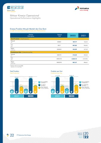 22 PT Pertamina Hulu Energi 2022Laporan TahunanAnnual ReportIkhtisar 20222022 HighlightsUraianDescriptionSatuanUnit 2022 2021Total Produksi | Total ProductionMinyak Oil MMBO 187,77 162,54GasGas BSCF 957,82 954,46Migas Oil & Gas MMBOE 353,09 327,28Produksi per Hari | Production per DayMinyak Oil MBOPD 514,44 445,30GasGas MMSCFD 2.624,15 2.614,96Migas Oil & Gas MBOEPD 967,37 896,65Kinerja Produksi Minyak Mentah dan Gas Bumi Crude Oil and Natural Gas Production Performance* Realisasi tidak termasuk M&A. Realization not include M&ATotal ProduksiTotal ProductionProduksi per Hari Production per Day2021 2022 2021 2022162,54 187,77 445,30 514,44954,462.614,96957,822.624,15327,28353,09 896,65 967,37Minyak (MMBO)Oil (MMBO)Minyak (MBOPD)Oil (MMBOPD)Gas (BSCF)Gas (BSCF)Gas (MMSCFD)Gas (BSCF)Migas (MMBOE)Oil & Gas (MMBOE)Migas (MBOEPD)Oil & Gas (MBOEPD)Operational Performance HighlightsIkhtisar Kinerja Operasional