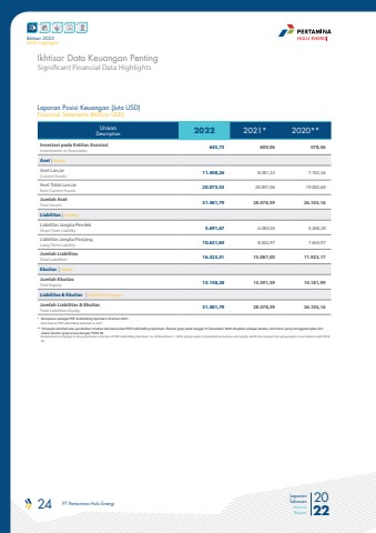 24 PT Pertamina Hulu Energi 2022Laporan TahunanAnnual ReportIkhtisar 20222022 HighlightsLaporan Posisi Keuangan (Juta USD) Financial Statements (Million USD)UraianDescription 2022 2021* 2020**Investasi pada Entitas AsosiasiInvestments in Associates 645,73 609,06 578,36Aset | AssetsAset LancarCurrent Assets 11.408,26 8.381,53 7.102,56Aset Tidak LancarNon-Current Assets 20.073,53 20.097,06 19.002,60Jumlah AsetTotal Assets 31.481,79 28.478,59 26.105,16Liabilitas | LiabilityLiabilitas Jangka PendekShort-Term Liability 5.691,67 6.584,03 4.268,20Liabilitas Jangka PanjangLong-Term Liability 10.631,84 8.502,97 7.654,97Jumlah LiabilitasTotal Liabilities 16.323,51 15.087,00 11.923,17Ekuitas | EquityJumlah EkuitasTotal Equity 15.158,28 13.391,59 14.181,99Liabilitas & Ekuitas | Liabilities & EquityJumlah Liabilitas & Ekuitas Total Liabilities Equity 31.481,79 28.478,59 26.105,16Significant Financial Data HighlightsIkhtisar Data Keuangan Penting* Beroperasi sebagai PHE Subholding Upstream di tahun 2021. Operated as PHE Subholding Upstream in 2021** Penyajian kembali atas perubahan struktur tata kelola dari PHE Subholding Upstream. Ekuitas grup pada tanggal 31 Desember 2020 disajikan sebagai ekuitas unit bisnis yang menggabungkan diri dalam ekuitas grup sesuai dengan PSAK 38. Restatement as changes to the governance structure of PHE Subholding Upstream. As of December 31, 2020, group equity is presented as business unit equity which has merged into group equity in accordance with PSAK 38.