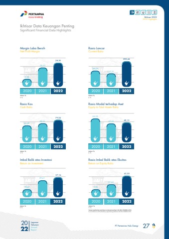 PT Pertamina Hulu Energi 27 2022Laporan TahunanAnnual ReportIkhtisar 20222022 HighlightsMargin Laba BersihNet Profit MarginRasio KasCash RatioImbal Balik atas InvestasiReturn on InvestmentRasio LancarCurrent RatioRasio Modal terhadap AsetEquity to Total Assets RatioRasio Imbal Balik atas EkuitasReturn on Equity Ratio2020202020202020202020202021202120212021202120212022202220222022202220226,5846,4918,67 3,95166,0654,3324,5348,9427,64127,3147,0229,6128,3079,0443,30200,4448,15 37,16Significant Financial Data HighlightsIkhtisar Data Keuangan Pentingdalam %In %dalam %In %dalam %In %dalam %In %dalam %In %dalam %In %Sesuai pedoman penilaian anak perusahaan A6-002-H40000-2019.In accordance with subsidiary appraisal guidelines A6-002-H40000-2019.