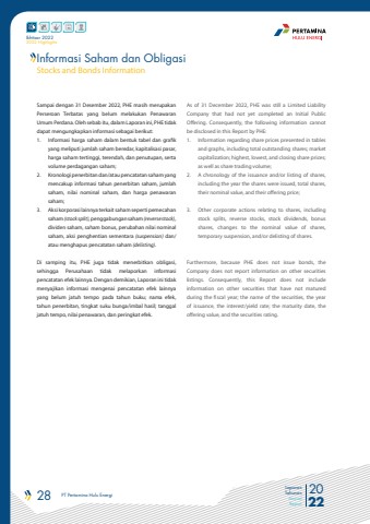 28 PT Pertamina Hulu Energi 2022Laporan TahunanAnnual ReportIkhtisar 20222022 HighlightsSampai dengan 31 Desember 2022, PHE masih merupakan Perseroan Terbatas yang belum melakukan Penawaran Umum Perdana. Oleh sebab itu, dalam Laporan ini, PHE tidak dapat mengungkapkan informasi sebagai berikut:1. Informasi harga saham dalam bentuk tabel dan grafik yang meliputi jumlah saham beredar, kapitalisasi pasar, harga saham tertinggi, terendah, dan penutupan, serta volume perdagangan saham;2. Kronologi penerbitan dan/atau pencatatan saham yang mencakup informasi tahun penerbitan saham, jumlah saham, nilai nominal saham, dan harga penawaran saham;3. Aksi korporasi lainnya terkait saham seperti pemecahan saham (stock split), penggabungan saham (reverse stock),dividen saham, saham bonus, perubahan nilai nominal saham, aksi penghentian sementara (suspension) dan/atau menghapus pencatatan saham (delisting).Di samping itu, PHE juga tidak menerbitkan obligasi, sehingga Perusahaan tidak melaporkan informasi pencatatan efek lainnya. Dengan demikian, Laporan ini tidak menyajikan informasi mengenai pencatatan efek lainnya yang belum jatuh tempo pada tahun buku; nama efek, tahun penerbitan, tingkat suku bunga/imbal hasil; tanggal jatuh tempo, nilai penawaran, dan peringkat efek.As of 31 December 2022, PHE was still a Limited Liability Company that had not yet completed an Initial Public Offering. Consequently, the following information cannot be disclosed in this Report by PHE:1. Information regarding share prices presented in tables and graphs, including total outstanding shares; market capitalization; highest, lowest, and closing share prices; as well as share trading volume;2. A chronology of the issuance and/or listing of shares, including the year the shares were issued, total shares, their nominal value, and their offering price;3. Other corporate actions relating to shares, including stock splits, reverse stocks, stock dividends, bonus shares, changes to the nominal value of shares, temporary suspension, and/or delisting of shares.Furthermore, because PHE does not issue bonds, the Company does not report information on other securities listings. Consequently, this Report does not include information on other securities that have not matured during the fiscal year; the name of the securities, the year of issuance, the interest/yield rate; the maturity date, the offering value, and the securities rating.Informasi Saham dan ObligasiStocks and Bonds Information