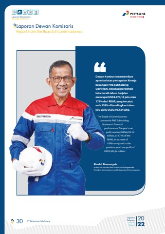 30 PT Pertamina Hulu Energi 2022Laporan TahunanAnnual ReportLaporan ManajemenManagement ReportRinaldi FirmansyahKomisaris Utama dan Komisaris IndependenPresident Commissioner and Independent CommissionerDewan Komisaris memberikan apresiasi atas pencapaian kinerja keuangan PHE Subholding Upstream. Realisasi perolehan laba bersih tahun berjalan mencapai USD4.674,16 juta atau 171% dari RKAP, yang tercatat naik 158% dibandingkan tahun lalu yaitu USD2.952,64 juta.The Board of Commissioners commends PHE Subholding Upstream's financial performance. The year's net profit reached USD4,674.16 million, or 171% of the RKAP, an increase of 158% compared to the previous year's net profit of USD2,952,64 million.%u201cLaporan Dewan KomisarisReport from the Board of Commissioners
