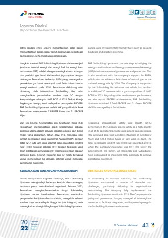 PT Pertamina Hulu Energi 43 2022Laporan TahunanAnnual ReportLaporan ManajemenManagement Reportlistrik rendah emisi seperti memanfaatkan solar panel, memanfaatkan bahan bakar ramah lingkungan seperti gas dan biodiesel, serta melakukan penghijauan. Langkah konkret PHE Subholding Upstream dalam menjadi jembatan transisi energi dari energi fosil ke energi baru terbarukan (EBT) adalah dengan meningkatkan cadangan dan produksi gas bumi. Hal tersebut juga sejalan dengan dukungan Perusahaan terhadap RUEN yang menargetkan pemakaian gas bumi mencapai porsi 24% dalam bauran energi nasional pada 2050. Perusahaan didukung oleh didukung oleh infrastruktur Subholding Gas telah menghasilkan penambahan sumber daya 2C dengan komposisi gas sebanyak 1.065 BCFG di 2022. Terkait kinerja lingkungan lainnya, kami melaporkan pencapaian PROPER. PHE Subholding Upstream melalui WK yang dikelola Anak Perusahaan memperoleh 7 PROPER Emas dan 21 PROPER Hijau. Dari sisi kinerja Keselamatan dan Kesehatan Kerja (K3), Perusahaan menempatkan aspek keselamatan sebagai prioritas utama dalam seluruh kegiatan operasi dan bisnis migas yang dijalankan. Tahun 2022, PHE mencapai nihil jumlah kecelakaan kerja (Number of Accident/NOA) dengan total 121,4 juta jam kerja selamat. Total Recordable Incident Rate (TRIR) tercatat sebesar 0,10 dengan toleransi yang telah ditetapkan perusahaan 0,11 (semakin rendah capaian semakin baik). Seluruh Regional dan AP telah berupaya untuk menerapkan K3 dengan optimal untuk mencapai operational excellence.KENDALA DAN TANTANGAN YANG DIHADAPIDalam menjalankan kegiatan usahanya, PHE Subholding Upstream menghadapi beberapa kendala dan tantangan, terutama pasca restrukturisasi organisasi. Selama 2022, Perusahaan mengimplementasikan fungsi Subholding Upstream secara keseluruhan. Perusahaan melakukan penyesuaian kebijakan dan tata kelola, mengelola seluruh sumber daya antarwilayah hingga tercipta integrasi, serta meningkatkan sinergi di lingkungan Subholding Upstream.panels, uses environmentally friendly fuels such as gas and biodiesel, and practices greening.PHE Subholding Upstream%u2019s concrete step in bridging the energy transition from fossil energy to new renewable energy (NRE) is to increase natural gas reserves and production. This is also consistent with the company%u2019s support for RUEN, which aims to achieve a 24% share of natural gas in the national energy mix by 2050. The Company is supported by the Subholding Gas infrastructure which has resulted in additional 2C resources with a gas composition of 1,065 BCFG in 2022. Regarding other environment performance, we also report PROPER achievements; PHE Subholding Upstream obtained 7 Gold PROPER and 21 Green PROPER via WKs managed by its Subsidiaries.Regarding Occupational Safety and Health (OHS) performance, the Company places safety as a high priority in all of its operational activities and oil and gas operations. PHE achieved zero work accidents (Number of Accidents/NOA) and 121.4 million hours of safe work in 2022. The Total Recordable Incident Rate (TRIR) was recorded at 0.10, while the Company%u2019s tolerance was 0.11 (the lower the achievement, the better). All Regionals and Subsidiaries have endeavored to implement OHS optimally to achieve operational excellence.OBSTACLES AND CHALLENGES FACEDIn conducting its business activities, PHE Subholding Upstream encountered a number of obstacles and challenges, particularly following its organizational restructuring. The Company fully implemented the Subholding Upstream function in 2022. The Company made policy and governance changes, managed all inter-regional resources to facilitate integration, and improved synergy in the Subholding Upstream environment.Report from the Board of DirectorsLaporan Direksi