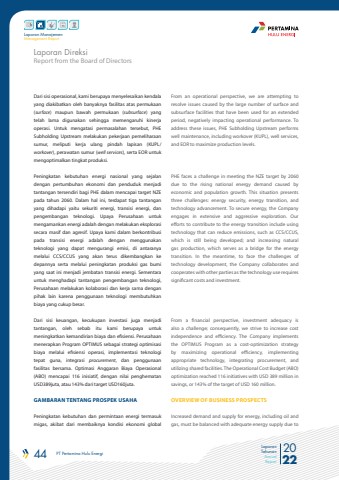 44 PT Pertamina Hulu Energi 2022Laporan TahunanAnnual ReportLaporan ManajemenManagement ReportDari sisi operasional, kami berupaya menyelesaikan kendala yang diakibatkan oleh banyaknya fasilitas atas permukaan (surface) maupun bawah permukaan (subsurface) yang telah lama digunakan sehingga memengaruhi kinerja operasi. Untuk mengatasi permasalahan tersebut, PHE Subholding Upstream melakukan pekerjaan pemeliharaan sumur, meliputi kerja ulang pindah lapisan (KUPL/workover), perawatan sumur (well services), serta EOR untuk mengoptimalkan tingkat produksi.Peningkatan kebutuhan energi nasional yang sejalan dengan pertumbuhan ekonomi dan penduduk menjadi tantangan tersendiri bagi%u00a0PHE dalam mencapai target%u00a0NZE pada tahun 2060. Dalam hal ini, terdapat tiga tantangan yang dihadapi yaitu sekuriti energi, transisi energi, dan pengembangan teknologi. Upaya Perusahaan untuk mengamankan energi adalah dengan melakukan eksplorasi secara masif dan agresif. Upaya kami dalam berkontribusi pada transisi energi adalah dengan menggunakan teknologi yang dapat mengurangi emisi, di antaranya melalui CCS/CCUS yang akan terus dikembangkan ke depannya serta melalui peningkatan produksi gas bumi yang saat ini menjadi jembatan transisi energi. Sementara untuk menghadapi tantangan pengembangan teknologi, Perusahaan melakukan kolaborasi dan kerja sama dengan pihak lain karena penggunaan teknologi membutuhkan biaya yang cukup besar.Dari sisi keuangan, kecukupan investasi juga menjadi tantangan, oleh sebab itu kami berupaya untuk meningkatkan kemandirian biaya dan efisiensi. Perusahaan menerapkan Program OPTIMUS sebagai strategi optimisasi biaya melalui efisiensi operasi, implementasi teknologi tepat guna, integrasi procurement, dan penggunaan fasilitas bersama. Optimasi Anggaran Biaya Operasional (ABO) mencapai 116 inisiatif, dengan nilai penghematan USD389juta, atau 143% dari target USD160juta.GAMBARAN TENTANG PROSPEK USAHAPeningkatan kebutuhan dan permintaan energi termasuk migas, akibat dari membaiknya kondisi ekonomi global From an operational perspective, we are attempting to resolve issues caused by the large number of surface and subsurface facilities that have been used for an extended period, negatively impacting operational performance. To address these issues, PHE Subholding Upstream performs well maintenance, including workover (KUPL), well services, and EOR to maximize production levels.PHE faces a challenge in meeting the NZE target by 2060 due to the rising national energy demand caused by economic and population growth. This situation presents three challenges: energy security, energy transition, and technology advancement. To secure energy, the Company engages in extensive and aggressive exploration. Our efforts to contribute to the energy transition include using technology that can reduce emissions, such as CCS/CCUS, which is still being developed; and increasing natural gas production, which serves as a bridge for the energy transition. In the meantime, to face the challenges of technology development, the Company collaborates and cooperates with other parties as the technology use requires significant costs and investment.From a financial perspective, investment adequacy is also a challenge; consequently, we strive to increase cost independence and efficiency. The Company implements the OPTIMUS Program as a cost-optimization strategy by maximizing operational efficiency, implementing appropriate technology, integrating procurement, and utilizing shared facilities. The Operational Cost Budget (ABO) optimization reached 116 initiatives with USD 389 million in savings, or 143% of the target of USD 160 million.OVERVIEW OF BUSINESS PROSPECTSIncreased demand and supply for energy, including oil and gas, must be balanced with adequate energy supply due to Report from the Board of DirectorsLaporan Direksi