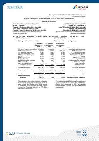 630 PT Pertamina Hulu Energi 2022Laporan TahunanAnnual ReportThe original consolidated financial statements included herein are in the Indonesian language.PT PERTAMINA HULU ENERGI TBK DAN ENTITAS ANAK/AND SUBSIDIARIES Daftar 5/191 ScheduleCATATAN ATAS LAPORAN KEUANGANKONSOLIDASIANTanggal 31 Desember 2022, 2021, dan 2020serta Untuk Tahun yang Berakhir padaTanggal-Tanggal 31 Desember 2020, 2021, dan 2020(Disajikan dalam ribuan dolar Amerika Serikat, kecuali dinyatakan lain)NOTES TO THE CONSOLIDATEDFINANCIAL STATEMENTSAs of December 31, 2022, 2021, and 2020and For The Years Ended December 31, 2022, 2021, and 2020 (Expressed in thousands of United States dollars,unless otherwise stated)44. SALDO DAN TRANSAKSI DENGAN PIHAK BERELASI (lanjutan)44. RELATED PARTIES BALANCES AND TRANSACTIONS (continued)c. Piutang usaha - pihak berelasi c. Trade receivables - related parties 31 Desember/ 31 Desember/ 31 Desember/ December 31, December 31, December 31, 2022 2021 2020 PT Kilang Pertamina Internasional 4.155.685 2.300.919 - PT Kilang Pertamina Internasional PT Pertamina (Persero) 128.848 52.505 2.350.440 PT Pertamina (Persero)PT Pertamina Patra Niaga 85.392 92.361 56.067 PT Pertamina Patra NiagaPT Pupuk Indonesia (Persero) 77.843 81.344 50.463 PT Pupuk Indonesia (Persero)PT Perusahaan Gas Negara 52.838 57.482 59.080 PT Perusahaan Gas NegaraDSLNG 33.112 17.991 12.464 DSLNGPT Perusahaan Listrik PT Perusahaan Listrik Negara (Persero) 23.258 28.062 33.500 Negara (Persero)PT Pertamina Power Indonesia 241 3.407 6.637 PT Pertamina Power IndonesiaPT Nusantara Regas 12 34 7.075 PT Nusantara RegasLain - lain (masing-masing Other (individually di bawah AS$4.000) 15.932 4.543 10.308 below US$4,000)Jumlah Piutang Usaha 4.573.161 2.638.648 2.586.034 Total Trade Receivables Penyisihan penurunan nilai (122.965) (40.360) (871) Allowance for impairmentJumlah 4.450.196 2.598.288 2.585.163 TotalPersentase terhadap jumlah aset 14.14% 9,12% 9,90% As a percentage of total assetsPiutang usaha dari entitas berelasi merupakan piutang penjualan minyak mentah atau gas bumi yang berasal dari Entitas Anak. Sejak tanggal 1 September 2021 transaksi penjualan minyak mentah ke Pertamina dialihkan ke PT Kilang Pertamina Internasional.The trade receivables from related parties involve crude oil or natural gas sold by the Subsidiaries.Starting from September 1, 2021, oil sales to Pertamina were assumed to PT Kilang Pertamina Internasional.