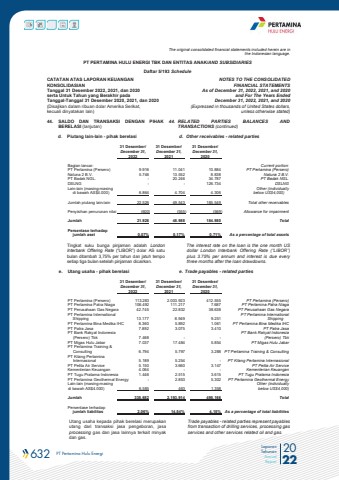 632 PT Pertamina Hulu Energi 2022Laporan TahunanAnnual ReportThe original consolidated financial statements included herein are in the Indonesian language.PT PERTAMINA HULU ENERGI TBK DAN ENTITAS ANAK/AND SUBSIDIARIES Daftar 5/193 ScheduleCATATAN ATAS LAPORAN KEUANGANKONSOLIDASIANTanggal 31 Desember 2022, 2021, dan 2020serta Untuk Tahun yang Berakhir padaTanggal-Tanggal 31 Desember 2020, 2021, dan 2020(Disajikan dalam ribuan dolar Amerika Serikat, kecuali dinyatakan lain)NOTES TO THE CONSOLIDATEDFINANCIAL STATEMENTSAs of December 31, 2022, 2021, and 2020and For The Years Ended December 31, 2022, 2021, and 2020 (Expressed in thousands of United States dollars,unless otherwise stated)44. SALDO DAN TRANSAKSI DENGAN PIHAK BERELASI (lanjutan)44. RELATED PARTIES BALANCES AND TRANSACTIONS (continued)d. Piutang lain-lain - pihak berelasi d. Other receivables - related parties 31 Desember/ 31 Desember/ 31 Desember/ December 31, December 31, December 31, 2022 2021 2020 Bagian lancar: Current portion:PT Pertamina (Persero) 9.916 11.041 10.884 PT Pertamina (Persero)Natuna 2 B.V. 5.746 13.552 8.838 Natuna 2 B.V.PT Badak NGL. - 20.246 34.787 PT Badak NGL.DSLNG - - 126.734 DSLNGLain-lain (masing-masing Other (individually di bawah AS$4.000) 6.864 4.704 4.306 below US$4,000)Jumlah piutang lain-lain 22.526 49.543 185.549 Total other receivablesPenyisihan penurunan nilai (600) (555) (569) Allowance for impairmentJumlah 21.926 48.988 184.980 TotalPersentase terhadap jumlah aset 0,07% 0,17% 0,71% As a percentage of total assetsTingkat suku bunga pinjaman adalah London Interbank Offering Rate (%u201cLIBOR%u201d) dolar AS satu bulan ditambah 3,75% per tahun dan jatuh tempo setiap tiga bulan setelah pinjaman dicairkan. The interest rate on the loan is the one month US dollar London Interbank Offering Rate (%u201cLIBOR%u201d) plus 3.75% per annum and interest is due every three months after the loan drawdowns.e. Utang usaha - pihak berelasi e. Trade payables - related parties 31 Desember/ 31 Desember/ 31 Desember/ December 31, December 31, December 31, 2022 2021 2020 PT Pertamina (Persero) 113.283 2.003.923 412.555 PT Pertamina (Persero)PT Pertamina Patra Niaga 106.492 111.217 7.687 PT Pertamina Patra NiagaPT Perusahaan Gas Negara 42.745 22.832 38.638 PT Perusahaan Gas NegaraPT Pertamina International PT Pertamina International Shipping 13.177 8.949 9.251 ShippingPT Pertamina Bina Medika IHC 8.360 5.892 1.061 PT Pertamina Bina Medika IHCPT Patra Jasa 7.892 3.075 3.410 PT Patra JasaPT Bank Rakyat Indonesia PT Bank Rakyat Indonesia (Persero) Tbk 7.468 - - (Persero) TbkPT Migas Hulu Jabar 7.037 17.484 5.854 PT Migas Hulu JabarPT Pertamina Training & Consulting 6.794 5.797 3.288 PT Pertamina Training & ConsultingPT Kilang Pertamina Internasional 5.189 5.254 - PT Kilang Pertamina InternasionalPT Pelita Air Service 5.150 3.660 3.147 PT Pelita Air ServiceKementerian Keuangan 4.064 - - Kementerian KeuanganPT Tugu Pratama Indonesia 1.446 2.515 3.615 PT Tugu Pratama IndonesiaPT Pertamina Geothermal Energy - 2.853 5.302 PT Pertamina Geothermal EnergyLain-lain (masing-masing Other (individually di bawah AS$4.000) 6.585 463 1.358 below US$4,000)Jumlah 335.682 2.193.914 495.166 TotalPersentase terhadap jumlah liabilitas 2,06% 14,54% 4,15% As a percentage of total liabilitiesUtang usaha kepada pihak berelasi merupakan utang dari transaksi jasa pengeboran, jasa processing gas dan jasa lainnya terkait minyak dan gas.Trade payables - related parties represent payables from transaction of drilling services, processing gas services and other services related oil and gas.