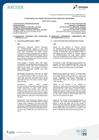 636 PT Pertamina Hulu Energi 2022Laporan TahunanAnnual ReportThe original consolidated financial statements included herein are in the Indonesian language.PT PERTAMINA HULU ENERGI TBK DAN ENTITAS ANAK/AND SUBSIDIARIES Daftar 5/197 ScheduleCATATAN ATAS LAPORAN KEUANGANKONSOLIDASIANTanggal 31 Desember 2022, 2021, dan 2020serta Untuk Tahun yang Berakhir padaTanggal-Tanggal 31 Desember 2020, 2021, dan 2020(Disajikan dalam ribuan dolar Amerika Serikat, kecuali dinyatakan lain)NOTES TO THE CONSOLIDATEDFINANCIAL STATEMENTSAs of December 31, 2022, 2021, and 2020and For The Years Ended December 31, 2022, 2021, and 2020 (Expressed in thousands of United States dollars,unless otherwise stated)45. PERJANJIAN, KOMITMEN DAN KONTINJENSI PENTING (lanjutan)45. SIGNIFICANT AGREEMENTS, COMMITMENTS AND CONTINGENCIES (continued)b. Sewa Barang Milik Negara (%u201cBMN%u201d) b. Lease of the State Owned Enterprises%u2019s Assets PEP PEPBerdasarkan Keputusan Menteri Keuangan No. 92/KMK.06/2008 tanggal 2 Mei 2008 ditetapkan bahwa status aset eks Pertamina Lama yang tidak dimasukkan ke dalam Neraca Pembukaan Pertamina sesuai dengan SK Menteri Keuangan No. 23/KMK.06/2008, adalah Barang Milik Negara (%u201cBMN%u201d) dimana pengelolaan barangbarang tersebut dilakukan oleh Direktorat Jendral Kekayaan Negara (%u201cDJKN%u201d).Based on the Minister of Finance Decree No. 92/KMK.06/2008 dated May 2, 2008 stipulates that the status of the ex-Old Pertamina assets not included in Pertamina's Opening Balance Sheet in accordance with the Minister of Finance Decree No. 23/KMK.06/2008, are State Assets (\where the management of such assets is carried out by Direktorat Jendral Kekayaan Negara (%u201cDJKN%u201d). Pada tanggal 7 Oktober 2008, SKK Migas menerbitkan surat kepada Menteri Keuangan yang menyarankan bahwa PEP dapat menggunakan BMN secara bebas. Pada tanggal 14 Januari 2009, Menteri Keuangan menolak saran yang diberikan SKK Migas.On October 7, 2008, SKK Migas issued a letter to the Minister of Finance suggesting that PEP could use BMN for free. On January 14, 2009, the Minister of Finance rejected the advice given by SKK Migas.Berdasarkan surat Menteri Keuangan cq. DJKN No. S-23/MK.6/2009 tanggal 21 Januari 2009, Pemerintah menyetujui untuk menerapkan skema sewa atas aset eks Pertamina Lama senilai Rp16.226.357 juta (nilai penuh) (setara dengan AS$1.444.269).Based on the Minister of Finance cq. DJKN Letter No.S-23/MK.6/2009 dated January 21, 2009, the Government agreed to implement a lease scheme for former Pertamina old assets amounting to Rp16,226,357 million (full amount) (equivalent to US$1,444,269).Berdasarkan risalah rapat tanggal 23 Januari 2009, yang dihadiri oleh Pertamina dan Menteri Keuangan cq. wakil DJKN, disetujui bahwa skema sewa berlaku untuk aset eks Pertamina Lama, kecuali untuk sumur dan tanah senilai Rp6.753.549 juta (nilai penuh), dengan jumlah sewa untuk aset yang bersangkutan senilai Rp9.472.808 juta (nilai penuh) untuk jangka waktu 32 tahun.Based on the minutes of the meeting on January 23, 2009, which was attended by Pertamina and the Minister of Finance cq. DJKN representative, agreed that the lease scheme applies to former Pertamina%u2019s assets, except for wells and land valued at Rp6,753,549 million (full amount), with total leases for the related assets of Rp9,472,808 million (full amount) for a period of 32 years.Berdasarkan Surat Keputusan Direktur Utama Pertamina No. Kpts-023/C00000/2009-S0 tanggal 6 Maret 2009, ditetapkan tarif sewa aset KKS sementara menunggu ditetapkannya kontrak sewa secara resmi oleh Kementerian Keuangan sebesar Rp9.472.808 juta (nilai penuh) untuk jangka waktu 32 tahun atau Rp296.025 juta (nilai penuh) per tahun.Based on the Decree of the President Director of Pertamina No. Kpts-023/C00000/2009-S0 dated March 6, 2009, the lease rate of PSC assets is determined while waiting for the official lease contract to be determined by the Ministry of Finance of Rp9,472,808 million (full amount) for a period of 32 years or Rp296,025 million (full amount) per year.