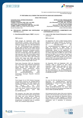 638 PT Pertamina Hulu Energi 2022Laporan TahunanAnnual ReportThe original consolidated financial statements included herein are in the Indonesian language.PT PERTAMINA HULU ENERGI TBK DAN ENTITAS ANAK/AND SUBSIDIARIES Daftar 5/199 ScheduleCATATAN ATAS LAPORAN KEUANGANKONSOLIDASIANTanggal 31 Desember 2022, 2021, dan 2020serta Untuk Tahun yang Berakhir padaTanggal-Tanggal 31 Desember 2020, 2021, dan 2020(Disajikan dalam ribuan dolar Amerika Serikat, kecuali dinyatakan lain)NOTES TO THE CONSOLIDATEDFINANCIAL STATEMENTSAs of December 31, 2022, 2021, and 2020and For The Years Ended December 31, 2022, 2021, and 2020 (Expressed in thousands of United States dollars,unless otherwise stated)45. PERJANJIAN, KOMITMEN DAN KONTINJENSI PENTING (lanjutan)45. SIGNIFICANT AGREEMENTS, COMMITMENTS AND CONTINGENCIES (continued)b. Sewa Barang Milik Negara (%u201cBMN%u201d) (lanjutan) b. Lease of the State Owned Enterprises%u2019s Assets (continued) PEP (lanjutan) PEP (continued)Pada tanggal 20 September 2016, telah ditandatangani Perjanjian Sewa Barang Milik Negara antara Kementerian Keuangan Republik Indonesia dengan PEP No. PRJ-3-MK.6/2016 dan No. 1307/EP0000/2016-S0 (%u201cPerjanjian%u201d) dengan dasar pengenaan sewa BMN sebesar Rp6.630.929 juta (nilai penuh) (setara dengan AS$504.560). Berdasarkan Perjanjian tersebut, Kementerian Keuangan Republik Indonesia tidak akan menagih biaya sewa atas BMN yang tidak digunakan oleh PEP karena BMN tersebut tidak termasuk dalam lingkup Perjanjian. Oleh karena itu, pada tahun 2016, PEP melakukan koreksi atas utang sewa BMN yang tidak digunakan oleh PEP senilai Rp1.527.330 juta (nilai penuh) (setara dengan AS$112.610).On September 20, 2016, a State Property Rental Agreement was signed between the Ministry of Finance of the Republic of Indonesia and PEP No. PRJ-3-MK.6/2016 andNo. 1307/EP0000/2016-S0 (\basis of imposition of BMN rental of Rp6,630,929 million (full amount) (equivalent to US$504,560). Based on the agreement, the Ministry of Finance of the Republic of Indonesia will not collect lease fees for BMN not used by PEP because the BMN is not included in the scope of the Agreement. Therefore, in 2016, PEP made corrections on BMN lease payable which was not used by PEP in the amount of Rp1,527,330 million (full amount) (equivalent to US$112,610). Pada bulan Desember 2022 dan September 2021 Perusahaan telah melakukan pembayaran atas utang sewa BMN senilai Rp207 miliar (setara dengan 2022: AS$13.247, 2021: AS$14.510) dengan pembayaran terakhir berdasarkan berdasarkan perjanjian sewa No. PRJ-1/MK.6/2022 atau No. 001/PEP00000/2022-SO antara Kementerian Keuangan Republik Indonesia dengan PEP.On December 2022 and September 2021, the Company made a payment for each period amounted of Rp207 billion (equivalent to 2022: US$13,247, 2021: US$14,510) with the latest payment based on lease agreement No. PRJ-1/MK.6/2022 or No. 001/PEP00000/2022-SO between the Ministry of Finance of the Republic of Indonesia and PEP. PHI PHI Pada tanggal 18 Juni 2019, Menteri Keuangan mengeluarkan Peraturan No. 89/PMK.06/2019 tentang Pengelolaan Aset Milik Negara dari Implementasi Perjanjian Kontrak Kerja Sama Hulu Minyak dan Gas Bumi (%u201cPMK No. 89/PMK.06/2019%u201d). Untuk periode sewa masa depan, metode perhitungan sewa aset akan mengacu pada PMK No. 89/PMK.06/2019.On June 18, 2019, the Minister of Finance issued Regulation No. 89/PMK.06/2019 regarding Management of State-Owned Assets from the Implementation of the Upstream Oil and Gas Cooperation Contract (\periods, the method of calculating asset leases will refer to PMK No.89/PMK.06/2019.PHI mengukur nilai wajar biaya pemanfaatan aset kepada Pemerintah dengan menggunakan nilai wajar aset yang digunakan dikurangi dengan faktor penyesuai dan insentif: a) pemetaan aset; b) penghapusan aset; c) biaya pengamanan; d) pelaporan aset; e) sertifikasi tanah; dan f) realisasi target produksi.PHI measures the fair value of the cost of utilizingassets to the Government using the fair value of the assets used deducted by adjustment factors and incentives: a) asset mapping; b) write-off assets; c) security costs; d) asset reporting; e) land certification; and f) realization of production targets.