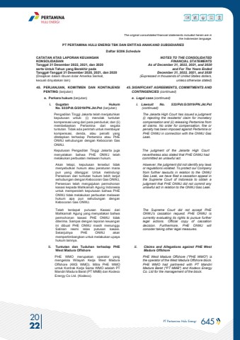 PT Pertamina Hulu Energi 645 2022The original consolidated financial statements included herein are in the Indonesian language.PT PERTAMINA HULU ENERGI TBK DAN ENTITAS ANAK/AND SUBSIDIARIES Daftar 5/206 ScheduleCATATAN ATAS LAPORAN KEUANGANKONSOLIDASIANTanggal 31 Desember 2022, 2021, dan 2020serta Untuk Tahun yang Berakhir padaTanggal-Tanggal 31 Desember 2020, 2021, dan 2020(Disajikan dalam ribuan dolar Amerika Serikat, kecuali dinyatakan lain)NOTES TO THE CONSOLIDATEDFINANCIAL STATEMENTSAs of December 31, 2022, 2021, and 2020and For The Years Ended December 31, 2022, 2021, and 2020 (Expressed in thousands of United States dollars,unless otherwise stated)45. PERJANJIAN, KOMITMEN DAN KONTINJENSI PENTING (lanjutan)45. SIGNIFICANT AGREEMENTS, COMMITMENTS AND CONTINGENCIES (continued)e. Perkara hukum (lanjutan) e. Legal case (continued)i. Gugatan HukumNo. 533/Pdt.G/2019/PN.Jkt.Pst (lanjutan)i. Lawsuit No. 533/Pdt.G/2019/PN.Jkt.Pst(continued)Pengadilan Tinggi Jakarta telah menjatuhkan keputusan untuk: (i) menolak tuntutan kompensasi uang dari para penduduk; dan (ii) membebaskan Pertamina dari segala tuntutan. Tidak ada perintah untuk membayar kompensasi, denda, atau penalti yang ditetapkan terhadap Pertamina atau PHE ONWJ sehubungan dengan Kebocoran Gas ONWJ.The Jakarta High Court has issued a judgment (i) rejecting the residents' claim for monetary compensation and (ii) releasing Pertamina from all claims. No order for compensation, fine or penalty has been imposed against Pertamina or PHE ONWJ in connection with the ONWJ Gas Leak. Keputusan Pengadilan Tinggi Jakarta juga menyatakan bahwa PHE ONWJ telah melakukan perbuatan melawan hukum.The judgment of the Jakarta High Court nevertheless also stated that PHE ONWJ had committed an unlawful act.Akan tetapi, keputusan tersebut tidak menyebutkan hukum atau peraturan mana pun yang dilanggar. Untuk melindungi Perseroan dari tuntutan hukum lebih lanjut sehubungan dengan Kebocoran Gas ONWJ, Perseroan telah mengajukan permohonan kasasi kepada Mahkamah Agung Indonesia untuk memperoleh keputusan bahwa PHE ONWJ tidak melakukan perbuatan melawan hukum apa pun sehubungan dengan Kebocoran Gas ONWJ. Telah terdapat putusan Kasasi dari Mahkamah Agung yang menyatakan bahwa permohonan kasasi PHE ONWJ tidak diterima. Sampai dengan laporan keuangan ini dibuat PHE ONWJ masih menunggu Salinan resmi relas putusan kasasi. Selanjutnya PHE ONWJ akan mempertimbangkan untuk melakukan upaya hukum lainnya. However, the judgment did not identify any laws or regulations violated. To protect our Company from further lawsuits in relation to the ONWJ Gas Leak, we have filed a cassation appeal in the Supreme Court of Indonesia to obtain a judgment that PHE ONWJ did not commit any unlawful act in relation to the ONWJ Gas Leak. The Supreme Court did not accept PHE ONWJ%u2019s cassation request. PHE ONWJ is currently evaluating its rights to pursue further legal actions. Official copy of cassation decision. Furthermore, PHE ONWJ will consider taking other legal measures.ii. Tuntutan dan Tuduhan terhadap PHE West Madura Offshoreii. Claims and Allegations against PHE West Madura Offshore PHE WMO merupakan operator yang mengelola Wilayah Kerja West Madura Offshore (KKS WMO). Mitra PHE WMO untuk Kontrak Kerja Sama WMO adalah PT Mandiri Madura Barat (PT MMB) dan Kodeco Energy Co Ltd. (Kodeco).PHE West Madura Offshore (\the operator of the West Madura Offshore block. PHE WMO had partnered with PT Mandiri Madura Barat (\Co. Ltd for the management of the block.