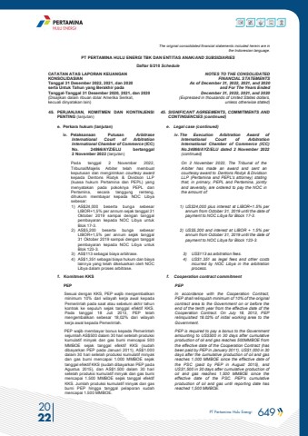PT Pertamina Hulu Energi 649 2022The original consolidated financial statements included herein are in the Indonesian language.PT PERTAMINA HULU ENERGI TBK DAN ENTITAS ANAK/AND SUBSIDIARIES Daftar 5/210 ScheduleCATATAN ATAS LAPORAN KEUANGANKONSOLIDASIANTanggal 31 Desember 2022, 2021, dan 2020serta Untuk Tahun yang Berakhir padaTanggal-Tanggal 31 Desember 2020, 2021, dan 2020(Disajikan dalam ribuan dolar Amerika Serikat, kecuali dinyatakan lain)NOTES TO THE CONSOLIDATEDFINANCIAL STATEMENTSAs of December 31, 2022, 2021, and 2020and For The Years Ended December 31, 2022, 2021, and 2020 (Expressed in thousands of United States dollars,unless otherwise stated)45. PERJANJIAN, KOMITMEN DAN KONTINJENSI PENTING (lanjutan)45. SIGNIFICANT AGREEMENTS, COMMITMENTS AND CONTINGENCIES (continued)e. Perkara hukum (lanjutan) e. Legal case (continued)iv. Pelaksanaan Putusan Arbitrase International Court of Arbitration International Chamber of Commerce (ICC) No. 24866/AYZ/ELU bertanggal 2 November 2022 (lanjutan)iv. The Execution Arbitration Award of International Court of Arbitration International Chamber of Commerce (ICC) No.24866/AYZ/ELU dated 2 November 2022(continued)Pada tanggal 2 November 2022, Tribunal/Majelis Arbiter telah membuat keputusan dan mengirimkan courtesy awardkepada Dentons Rodyk & Dividson LLP (kuasa hukum Pertamina dan PEPL) yang menyatakan pada pokoknya PEPL dan Pertamina, secara tanggung renteng, dihukum membayar kepada NOC Libya sebesar:1) AS$24,000 beserta bunga sebesar LIBOR+1,5% per annum sejak tanggal 31 Oktober 2019 sampai dengan tanggal pembayaran kepada NOC Libya untuk Blok 17-3.2) AS$5,200 beserta bunga sebesar LIBOR+1,5% per annum sejak tanggal 31 Oktober 2019 sampai dengan tanggal pembayaran kepada NOC Libya untuk Blok 123-3.On 2 November 2022, The Tribunal of the Arbiter has made an award and sent an courtessy award to Dentons Rodyk & Dividson LLP (Pertamina and PEPL's attorney) stating that, in primary, PEPL and Pertamina, jointly and severally, are ordered to pay the NOC in the amount of:1) US$24,000 plus interest at LIBOR+1.5% per annum from October 31, 2019 until the date of payment to NOC Libya for Block 17-3.2) US$5,200 and interest at LIBOR + 1.5% per annum from October 31, 2019 until the date of payment to NOC Libya for Block 123-3.3) AS$113 sebagai biaya arbitrase.4) AS$1,351 sebagai biaya hukum dan biaya lainnya yang telah dikeluarkan oleh NOC Libya dalam proses arbitrase.3) US$113 as arbitration fees.4) US$1.351 as legal fees and other costs incurred by NOC Libya in the arbitration process.f. Komitmen KKS f. Cooperation contract commitmentPEP PEPSesuai dengan KKS, PEP wajib mengembalikan minimum 10% dari wilayah kerja awal kepada Pemerintah pada saat atau sebelum akhir tahun kontrak ke sepuluh sejak tanggal efektif KKS. Pada tanggal 18 Juli 2013, PEP telah mengembalikan sebesar 18,02% dari wilayah kerja awal kepada Pemerintah.In accordance with the Cooperation Contract, PEP shall relinquish minimum of 10% of the original contract area to the Government on or before the end of the tenth year from the effective date of the Cooperation Contract. On July 18, 2013, PEP relinquished 18.02% of initial working area to the Government.PEP wajib membayar bonus kepada Pemerintah sejumlah AS$500 dalam 30 hari setelah produksi kumulatif minyak dan gas bumi mencapai 500 MMBOE sejak tanggal efektif KKS (sudah dibayarkan PEP pada Januari 2011), AS$1.000 dalam 30 hari setelah produksi kumulatif minyak dan gas bumi mencapai 1.000 MMBOE sejak tanggal efektif KKS (sudah dibayarkan PEP pada Agustus 2015), dan AS$1.500 dalam 30 hari setelah produksi kumulatif minyak dan gas bumi mencapai 1.500 MMBOE sejak tanggal efektif KKS. Jumlah produksi kumulatif minyak dan gas bumi PEP hingga tanggal pelaporan sudah mencapai 1.500 MMBOE.PEP is required to pay a bonus to the Government amounting to US$500 in 30 days after cumulative production of oil and gas reaches 500MMBOE from the effective date of the Cooperation Contract (has been paid by PEP in January 2011), US$1,000 in 30 days after the cumulative production of oil and gas reaches 1,000 MMBOE since the effective date of the PSC (paid by PEP in August 2015), and US$1,500 in 30 days after cumulative production of oil and gas reaches 1,500 MMBOE since the effective date of the PSC. PEP%u2019s cumulative production of oil and gas until reporting date has reached 1,500 MMBOE.