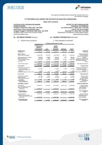 666 PT Pertamina Hulu Energi 2022Laporan TahunanAnnual ReportThe original consolidated financial statements included herein are in the Indonesian language.PT PERTAMINA HULU ENERGI TBK DAN ENTITAS ANAK/AND SUBSIDIARIES Daftar 5/227 ScheduleCATATAN ATAS LAPORAN KEUANGANKONSOLIDASIANTanggal 31 Desember 2022, 2021, dan 2020serta Untuk Tahun yang Berakhir padaTanggal-Tanggal 31 Desember 2020, 2021, dan 2020(Disajikan dalam ribuan dolar Amerika Serikat, kecuali dinyatakan lain)NOTES TO THE CONSOLIDATEDFINANCIAL STATEMENTSAs of December 31, 2022, 2021, and 2020and For The Years Ended December 31, 2022, 2021, and 2020 (Expressed in thousands of United States dollars,unless otherwise stated)46. INFORMASI SEGMEN (lanjutan) 46. SEGMENT INFORMATION (continued)2. Operasi lainnya (lanjutan) 2. Other operations (continued) 31 Desember/December 31, 2021 Eksplorasi dan produksi minyak Jumlah dan gas/ sebelum Exploration eliminas/ and production Jasa/ Total before Eliminasi/ Jumlah/ of oil and gas Services elimination Elimination Total PENDAPATAN REVENUESPendapatan 11.356.487 870.730 12.227.217 (487.136) 11.740.081 Revenues Beban segmen Segment expenses Beban pokok pendapatan (3.525.320) (701.973) (4.227.293) 460.751 (3.766.542) Cost of revenues Salaries and employees Biaya gaji upah dan tunjangan (333.080) (26.656) (359.736) 3.588 (356.148) benefitsBiaya pemeliharaan (33.255) (565) (33.820) - (33.820) Repairs and maintenance Beban depresiasi, deplesi (2.224.873) (85.067) (2.309.940) 25.196 (2.284.744) Depreciation, depletion and dan amortisasi amortization expenses Lain - lain (223.314) (17.315) (240.629) 14.923 (225.706) Others Jumlah beban segmen (6.339.842) (831.576) (7.171.418) 504.458 (6.666.960) Total segment expenses Laba segmen 5.016.645 39.154 5.055.799 17.322 5.073.121 Segment profitPenyisihan penurunan nilai Provision for impairment of aset non-keuangan (114.627) - (114.627) (1.362) (115.989) non-financial assets Penyisihan penurunan nilai Provision for impairment of goodwill (415) - (415) - (415) goodwill(Beban)/pendapatan lain-lain, neto 163.567 1.774 165.341 (268.394) (103.053) Other (expense)/income, netLaba operasi 5.065.170 40.928 5.106.098 (252.434) 4.853.664 Operating profit Penghasilan keuangan 27.124 2.877 30.001 - 30.001 Finance incomeBeban keuangan (137.192) (16.572) (153.764) (214) (153.978) Finance costs Keuntungan/(rugi) selisih Foreign exchange kurs, neto 5.611 (632) 4.979 315 5.294 gain/(loss), netLaba sebelum Profit before pajak penghasilan 4.960.713 26.601 4.987.314 (252.333) 4.734.981 income taxes INFORMASI LAINNYA OTHER INFORMATIONAset segmen 54.628.737 1.101.509 55.730.246 (67.617.134) (11.886.888) Segment assets Aset Perusahaan dan entitas Unallocated assets anak yang tidak dapat of the Company dialokasikan 40.365.476 - 40.365.476 - 40.365.476 and subsidiaries Total aset yang Total consolidated dikonsolidasikan 94.994.213 1.101.509 96.095.722 (67.617.134) 28.478.588 assets Liabilitas segmen 40.232.295 415.782 40.648.077 (53.208.661) (12.560.584) Segment liabilitiesLiabilitas Perusahaan dan Unallocated liabilitiesentitas anak yang tidak dapat of the Companydialokasikan 27.647.582 - 27.647.582 - 27.647.582 and subsidiaries Total liabilitas yang Total consolidated dikonsolidasikan 67.879.877 415.782 68.295.659 (53.208.661) 15.086.998 liabilities