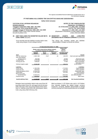 672 PT Pertamina Hulu Energi 2022Laporan TahunanAnnual ReportThe original consolidated financial statements included herein are in the Indonesian language.PT PERTAMINA HULU ENERGI TBK DAN ENTITAS ANAK/AND SUBSIDIARIES Daftar 5/233 ScheduleCATATAN ATAS LAPORAN KEUANGANKONSOLIDASIANTanggal 31 Desember 2022, 2021, dan 2020serta Untuk Tahun yang Berakhir padaTanggal-Tanggal 31 Desember 2020, 2021, dan 2020(Disajikan dalam ribuan dolar Amerika Serikat, kecuali dinyatakan lain)NOTES TO THE CONSOLIDATEDFINANCIAL STATEMENTSAs of December 31, 2022, 2021, and 2020and For The Years Ended December 31, 2022, 2021, and 2020 (Expressed in thousands of United States dollars,unless otherwise stated)48. ASET DAN LIABILITAS MONETER DALAM MATA UANG ASING (lanjutan)48. MONETARY ASSETS AND LIABILITIES DENOMINATED IN FOREIGN CURRENCY (continued)Grup memiliki aset dan liabilitas moneter dalam matauang asing dengan rincian sebagai berikut:The Group has monetary assets and liabilities denominated in foreign currencies as follows: 31 Desember/December 31, 2020 Setara AS$ Dalam mata uang aslinya (dalam jutaan)/ (dalam In original currency (in millions) ribuan)/ Rupiah/ Euro/ Lain-lain/ US$ Equivalent Rupiah Euro Others (in thousand)Aset AssetsKas dan setara kas 5.939. 958 19,67 26 452.970 Cash and cash equivalentsKas yang dibatasi penggunannya 662.696 - - 46.983 Restricted cashPiutang usaha 3.332.698 - - 236.278 Trade receivables Piutang lain-lain 1.095.861 - - 77.693 Other receivables Estimated claimEstimasi tagihan pajak 8.546.395 - - 605.912 for tax refundLiabilitas LiabilitiesUtang usaha (1.594.208) - - (113.024) Trade payablesUtang lain-lain (359.367) - - (25.478) Other payablesUtang pemegang saham (4.435.279) - - (314.447) Shareholder loanUtang pajak (1.227.446) - - (87.022) Taxes payableBiaya akrual dan Accrued expensesprovisi lain-lain (2.876.477) - - (203.933) and other provisionPinjaman bank (628.863) - - (44.584) Bank loansAset/(Liabilitas) Neto 8.455.968 19,67 26 631.348 Net Assets/(Liabilities)Sebagian besar pembelian dalam mata uang Dolar AS juga dijual dalam Dolar AS, sehingga lindung nilai atas risiko nilai tukar mata uang asing terjadi secara alami. Saat ini, liabilitas yang timbul dari pembiayaan dalam mata uang asing tidak dilindung nilai.Most purchases in US Dollars also sold in US Dollars, thus naturally hedging the related foreign currency exposures. Currently, liabilities denominated in foreign currency arising from financing activities are not hedged.