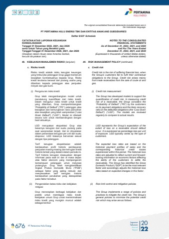 676 PT Pertamina Hulu Energi 2022Laporan TahunanAnnual ReportThe original consolidated financial statements included herein are in the Indonesian language.PT PERTAMINA HULU ENERGI TBK DAN ENTITAS ANAK/AND SUBSIDIARIES Daftar 5/237 ScheduleCATATAN ATAS LAPORAN KEUANGANKONSOLIDASIANTanggal 31 Desember 2022, 2021, dan 2020serta Untuk Tahun yang Berakhir padaTanggal-Tanggal 31 Desember 2020, 2021, dan 2020(Disajikan dalam ribuan dolar Amerika Serikat, kecuali dinyatakan lain)NOTES TO THE CONSOLIDATEDFINANCIAL STATEMENTSAs of December 31, 2022, 2021, and 2020and For The Years Ended December 31, 2022, 2021, and 2020 (Expressed in thousands of United States dollars,unless otherwise stated)49. KEBIJAKAN MANAJEMEN RISIKO (lanjutan) 49. RISK MANAGEMENT POLICY (continued)c. Risiko kredit c. Credit risk Risiko kredit adalah risiko kerugian keuangan yang timbul jika pelanggan Grup gagal memenuhi kewajiban kontraktualnya kepada Grup. Risiko kredit terutama berasal dari piutang usaha yang diberikan kepada pelanggan atas penjualan minyak dan gas bumi. Credit risk is the risk of suffering financial loss, when the Group%u2019s customers fail to fulfil their contractual obligations to the Group. Credit risk arises mainly from trade receivables from the sale of crude oil and gas. (i) Pengukuran risiko kredit (i) Credit risk measurementGrup telah mengembangkan model untuk mendukung kuantifikasi dari risiko kredit. Dalam mengukur risiko kredit untuk kredit yang diberikan, Grup mempertimbangkan %u201cProbability of Default%u201d (%u201cPD%u2019%u2019) pelanggan atas kewajiban dan kemungkinan rasio pemulihan atas kewajiban yang telah wanprestasi (%u201cLoss Given Default%u201d) (%u201cLGD%u2019%u2019). Model ini ditelaah secara rutin untuk membandingkan dengan hasil aktualnya.The Group has developed models to support the quantification of credit risk. In measuring credit risk of a receivable, the Group considers the %u201cProbability of Default%u201d (%u201cPD%u201d) by the customers on its payment obligations and the likely recovery ratio on the defaulted obligations (the %u201cLoss Given Default%u201d) (%u201cLGD%u201d). The models are reviewed regularly to compare to actual results.LGD merupakan ekspektasi Grup atas besarnya kerugian dari suatu piutang pada saat wanprestasi terjadi. Hal ini dinyatakan dalam persentase kerugian per unit dari suatu eksposur. LGD biasanya bervariasi sesuai dengan tipe pelanggan.LGD represents the Group%u2019s expectation of the extent of loss on a receivable should default occur. It is expressed as percentage loss per unit of exposure. LGD typically varies by the type of customers.Tarif kerugian ekspektasian adalah berdasarkan profil historis pembayaran penjualan masing-masing dan kerugian kredit historis terkait yang dialami dalam periode ini. Tarif historis kerugian disesuaikan dengan informasi pada saat ini dan di masa depan atas faktor ekonomi yang mempengaruhi kemampuan pelanggan untuk melunasi piutangnya. Grup telah mengidentifikasi tingkat Produk Domestik Bruto (%u201cPDB%u201d) sebagai faktor yang paling relevan dan menyesuaikan tarif kerugian historis berdasarkan perubahan yang diekspektasi pada faktor tersebut.The expected loss rates are based on the historical payment profiles of sales and the corresponding historical credit losses experienced within this period. The historical loss rates are adjusted to reflect current and forwardlooking information on economic factors affecting the ability of the customers to settle the receivables. The Group has identified the Gross Domestic Product (%u201cGDP%u201d) to be the most relevant factor and accordingly adjusts the historical loss rates based on expected changes in this factor.(ii) Pengendalian batas risiko dan kebijakan mitigasi(ii) Risk limit control and mitigation policiesGrup menerapkan berbagai kebijakan dan praktik untuk memitigasi risiko kredit.Kebijakan umum Grup untuk meminimalisasi risiko kredit yang mungkin muncul adalah sebagai berikut:The Group implements a range of policies and practices to mitigate the credit risk. The Group%u2019s general policies to minimise the potential credit risk which may arise are as follows:
